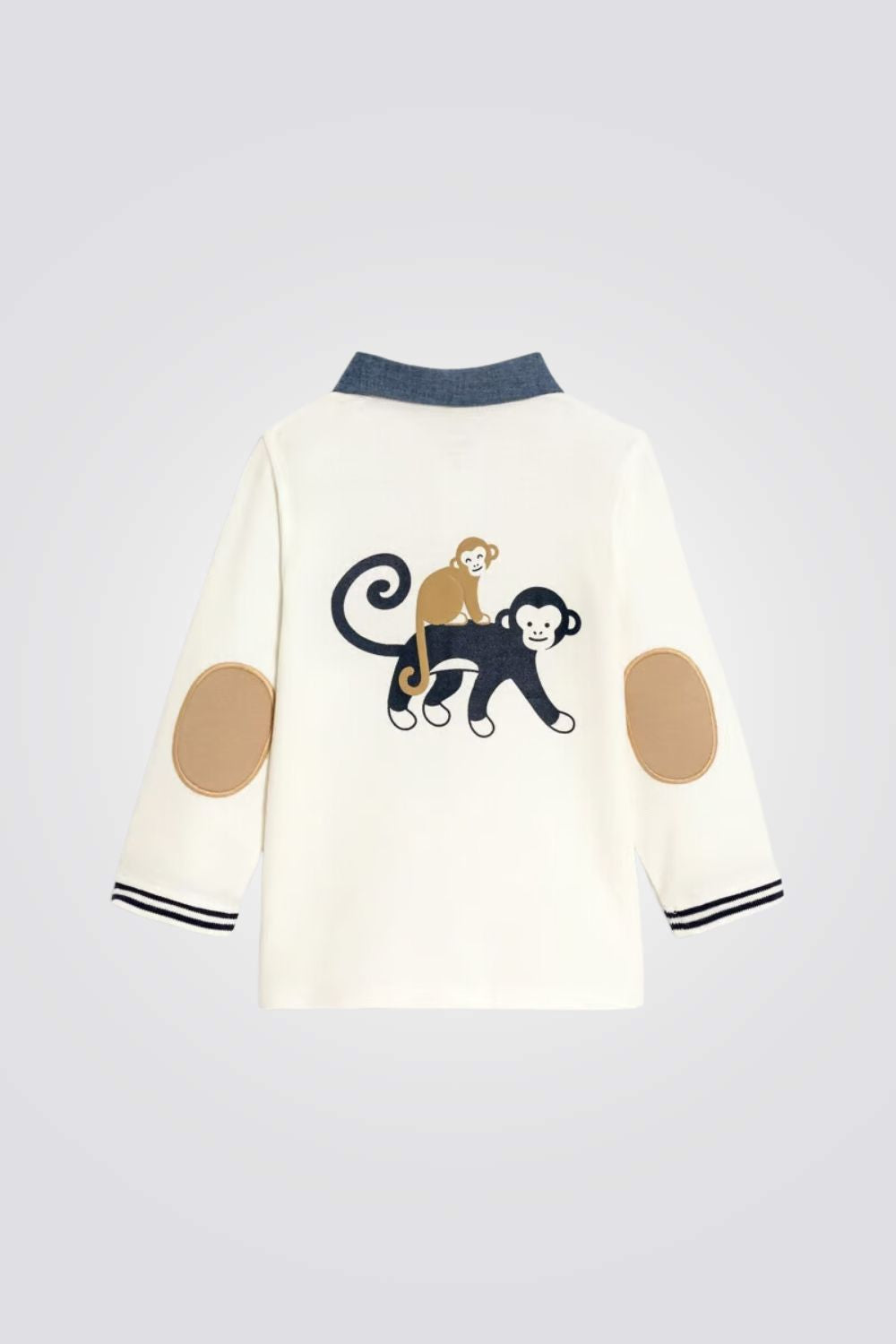 חולצת פולו ארוכה לתינוקות מבית המותג OBAIBI, בצבע לבן בסגנון פיקה , עם צווארון וכיס קידמי בצבע כחול ג'ינס , כפתורים , והדפס קופים מאחורה.
