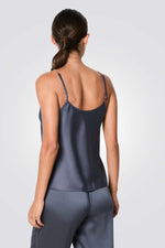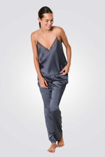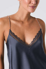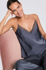 גופיית פיג'מה מבית המותג ETAM העשויה בד סאטן בעלת קו מחשוף V עם עיטורי תחרה , מפתח גב עגול גבוהה וכתפיות מתכווננות בשיבוץ אבנים עדינות.