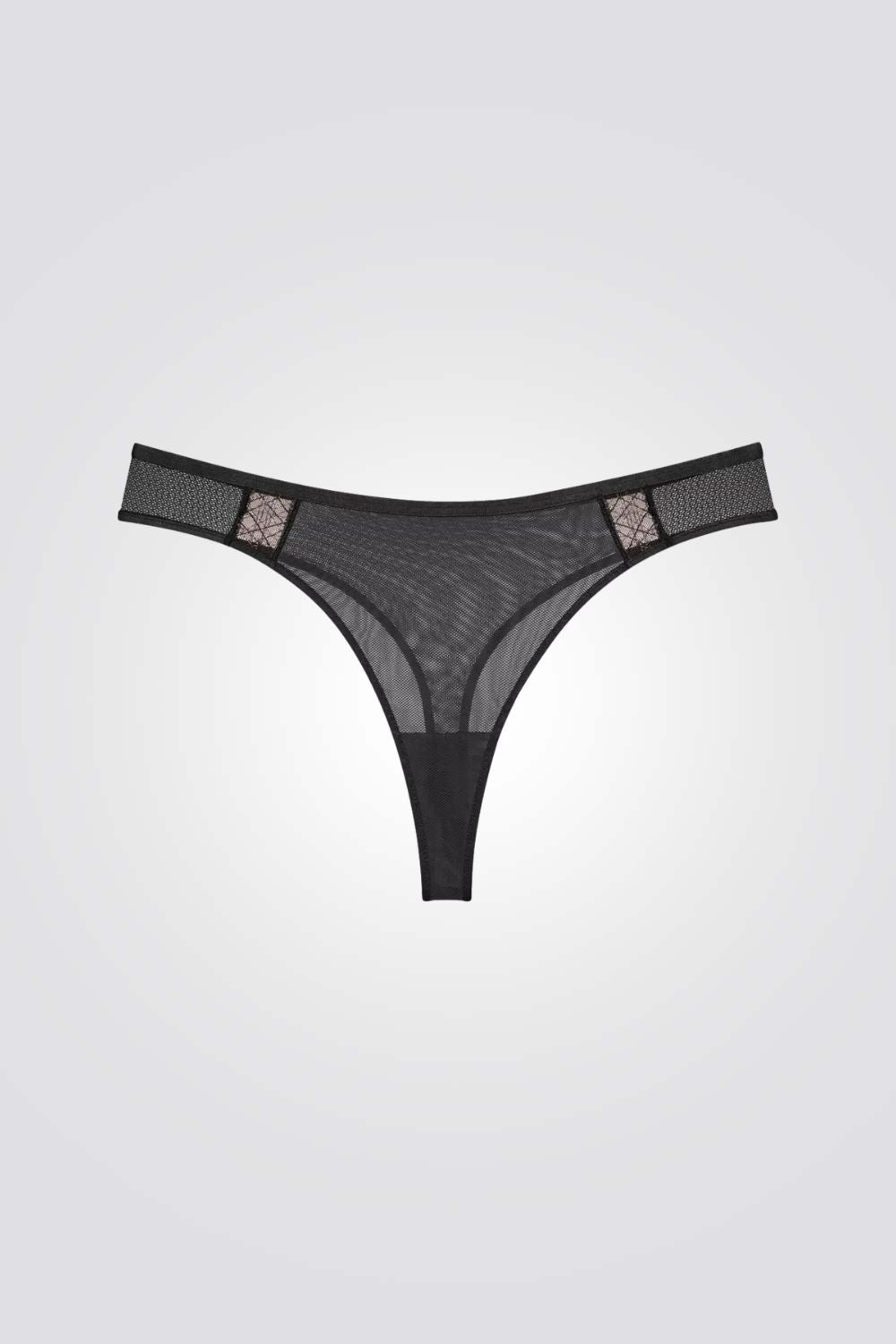 תחתון חוטיני מבית המותג TRIUMPH לנשים בצבע שחור, בגזרה נמוכה, מותאם ללא תפרים ללבישה חלקה מתחת לבגדים צמודים ומעוצב מבד בסגנון רשת אטום.