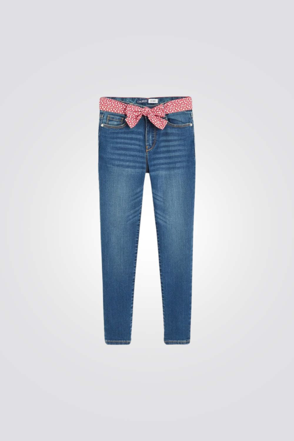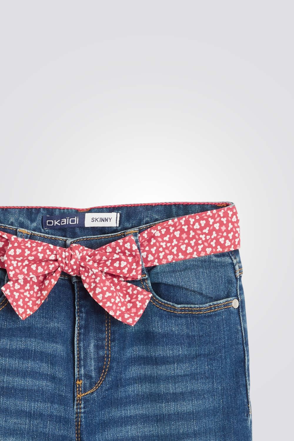 מכנסי ג'ינס לילדות מבית המותג OKAIDI, עם חגורה בצבע ורוד , נוח ונמתח, פתיחת כפתור ורוכסן , חמישה כיסים ומותן מתכווננת לנוחות מירבית.