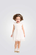 שמלה לתינוקות מבית המותג OBAIBI, בצבע לבן,אלגנטית ונוחה בגזרה מתרחבת עם שרוולי מלמלה.