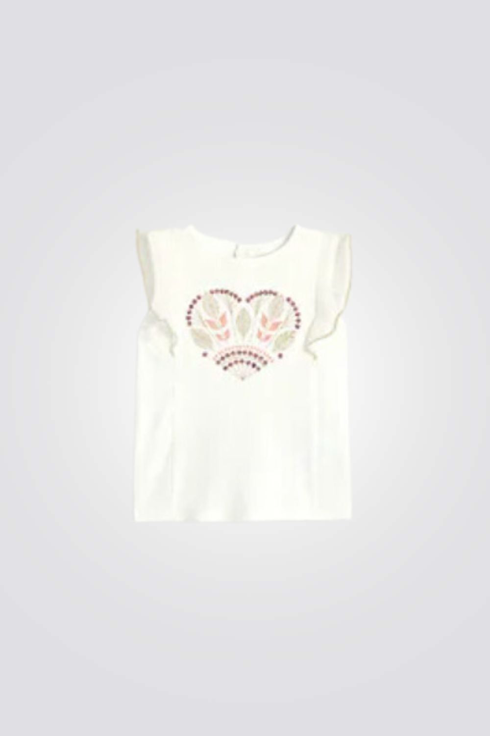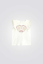 טישירט לתיונוקת מבית המותג OBAIBI, בצבע לבן עם הדפס מתוק , שרוולים קצרים עם מלמלה וצווארון עגול.