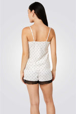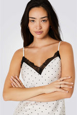 גופיית סאטן מבית המותג הצרפתי ETAM עשויה מבד רך עם רצועות מתכוננות, עיטורי תחרה באיזור המחשוף ובפרינט עדין של נקודות,