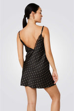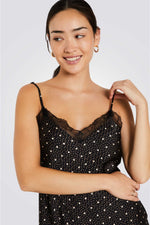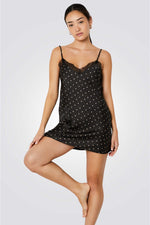 כותונת סאטן שחורה מבית המותג הצרפתי ETAM עשויה מבד רך עם רצועות מתכוננות, עיטורי תחרה באיזור המחשוף, גב פתוח ופרינט נקודות בצבע לבן