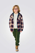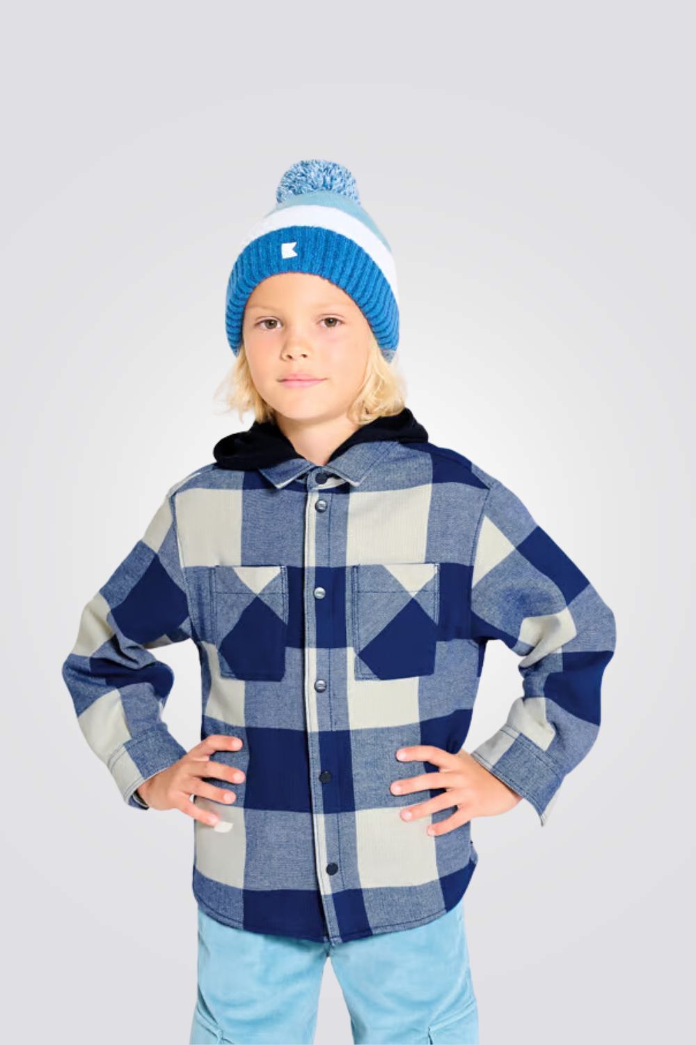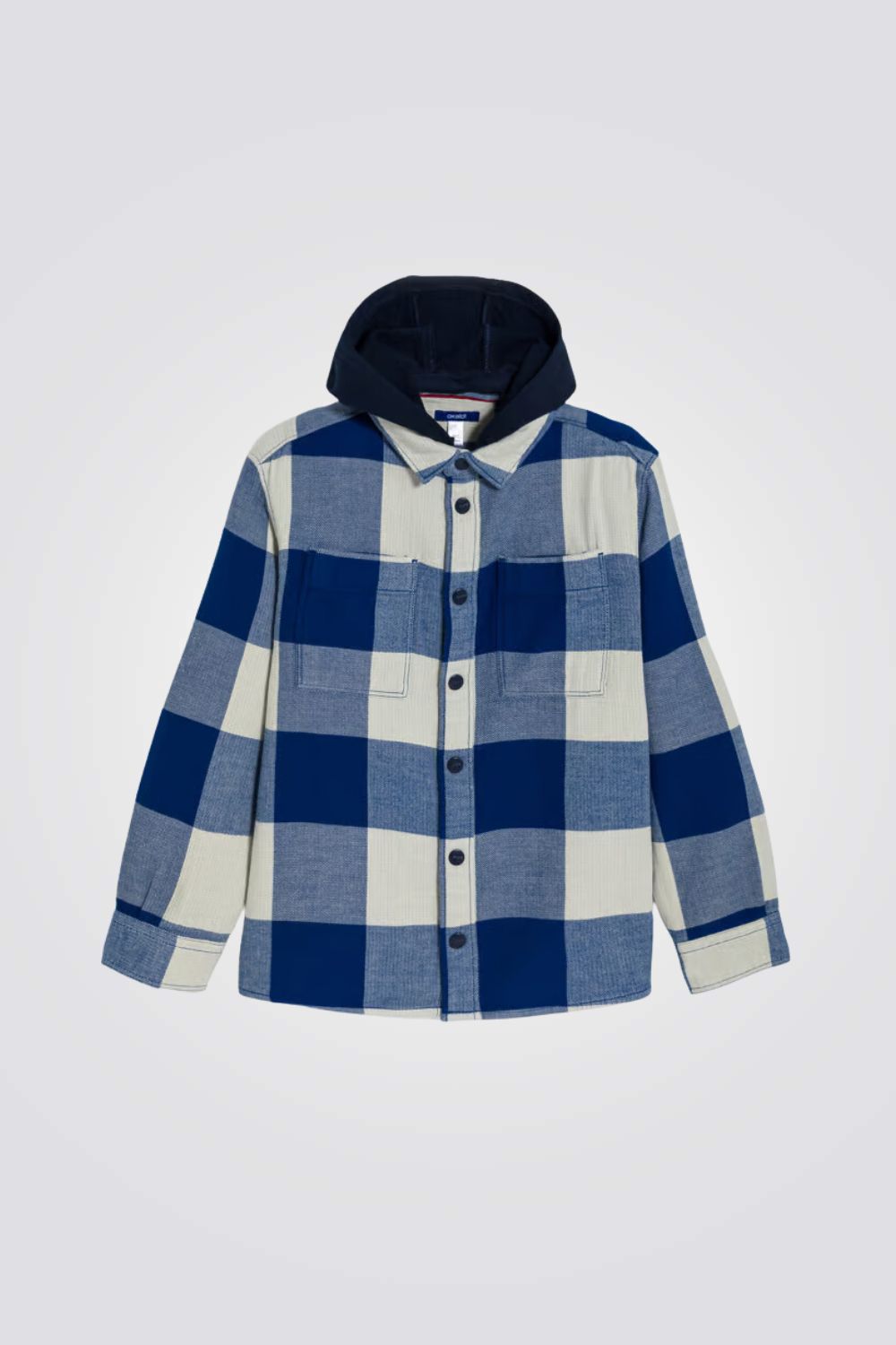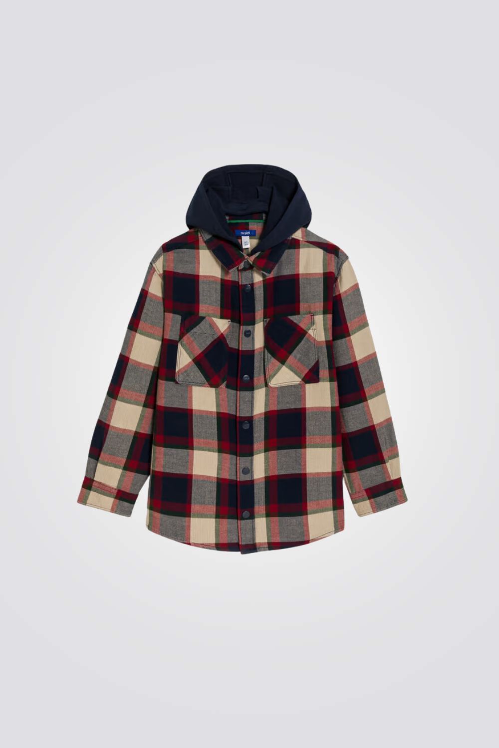 חולצה מכופתרת לילדים מבית המותג OKAIDI,עם קפוצ'ון והדפס משבצות , פתיחת כפתורים ושני כיסים בחזה.