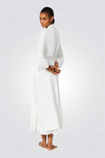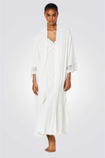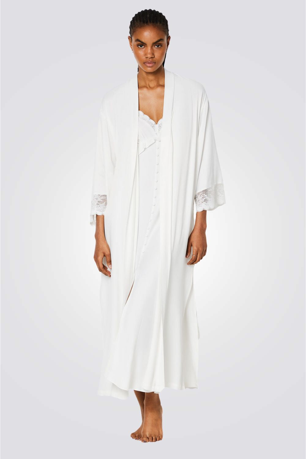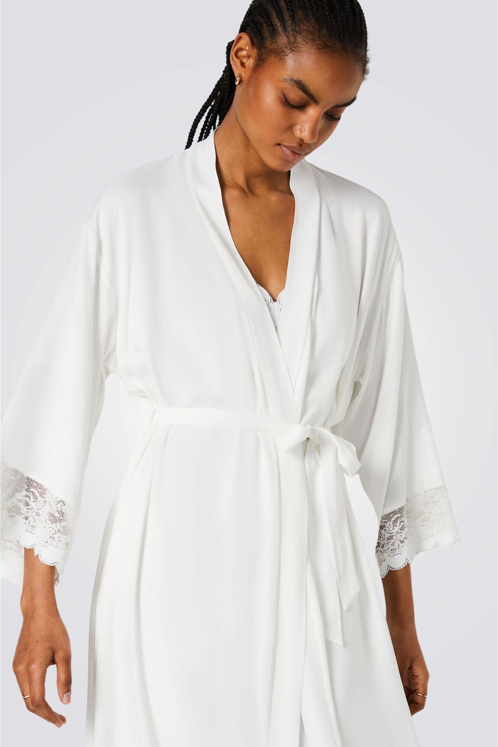 חלוק סאטן ארוך מבית המותג הצרפתי ETAM עשוי בד עדין וזוהר בגזרה ארוכה וחבה עם עיטורי תחרה פרחוניים בקצוות השרוולים ובאיזור המחשוף.