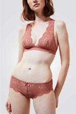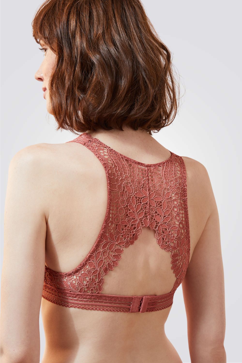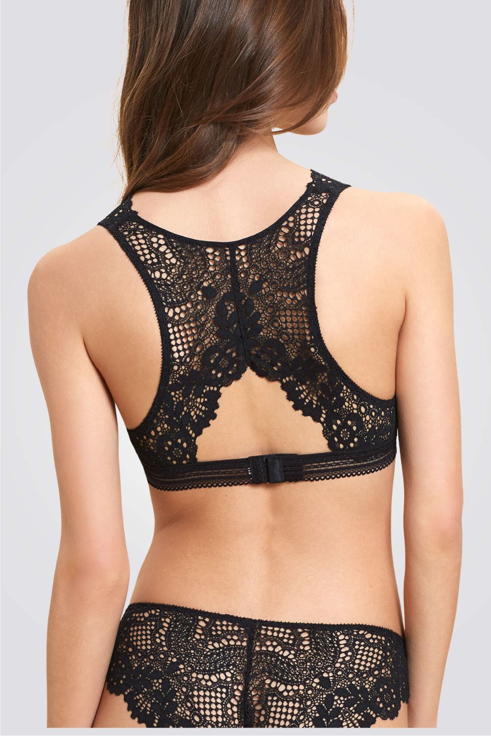 ברלט תחרה מבית המותג ETAM העשוי כולו תחרה פרחונית לא אטומה, ללא ברזלים או ריפוד, בעל גב עם פתח משולש וסגירת קרסים.