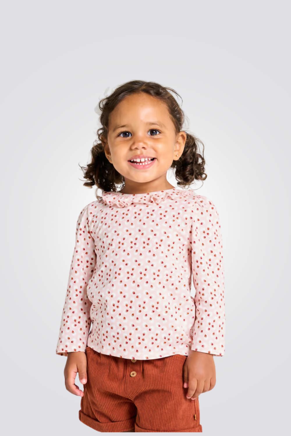 טישירט לתינוקות מבית המותג OBAIBI, בצבע ורוד עם הדפס פרחוני, שרוולים ארוכים וצווארון עגול עם מלמלה .