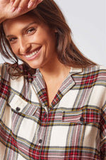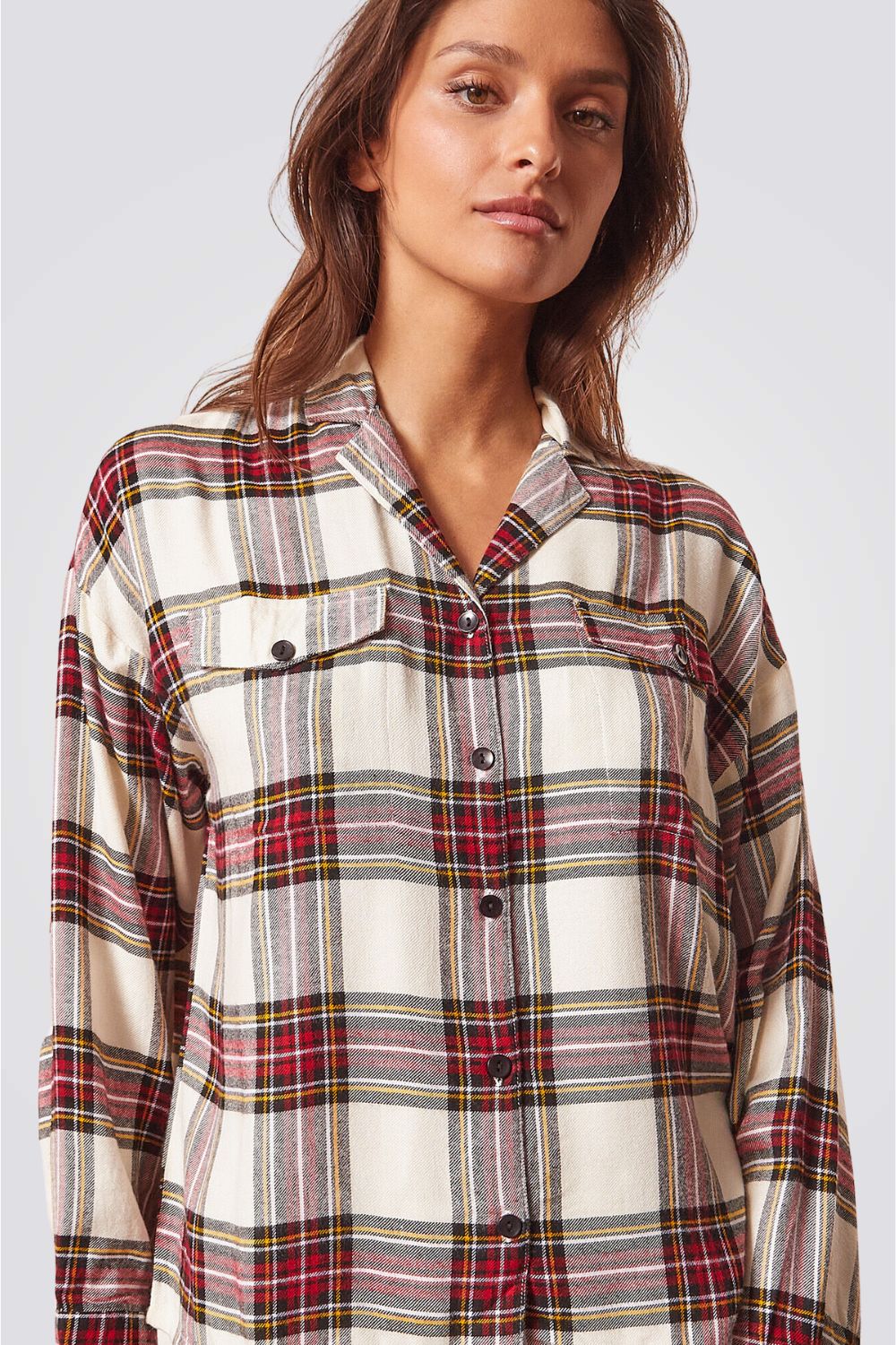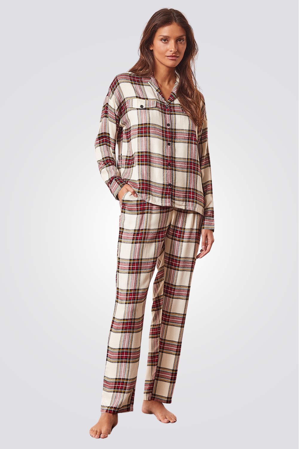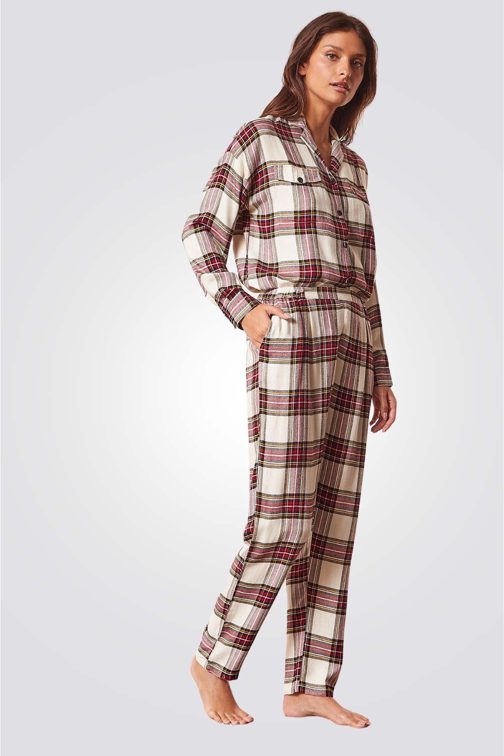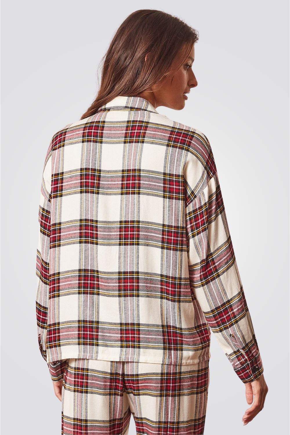 סט פיג'מה לנשים מבית המותג הצרפתי ETAM, מושלם לענות החורף והמעבר! בהדפס משובץ בגווני אדום ולבן המורכב במחולצה מכופתרת עם כיס בחלקה העליון של החולצה ומכנסיים תואמים עם שרט קשירה.
