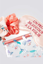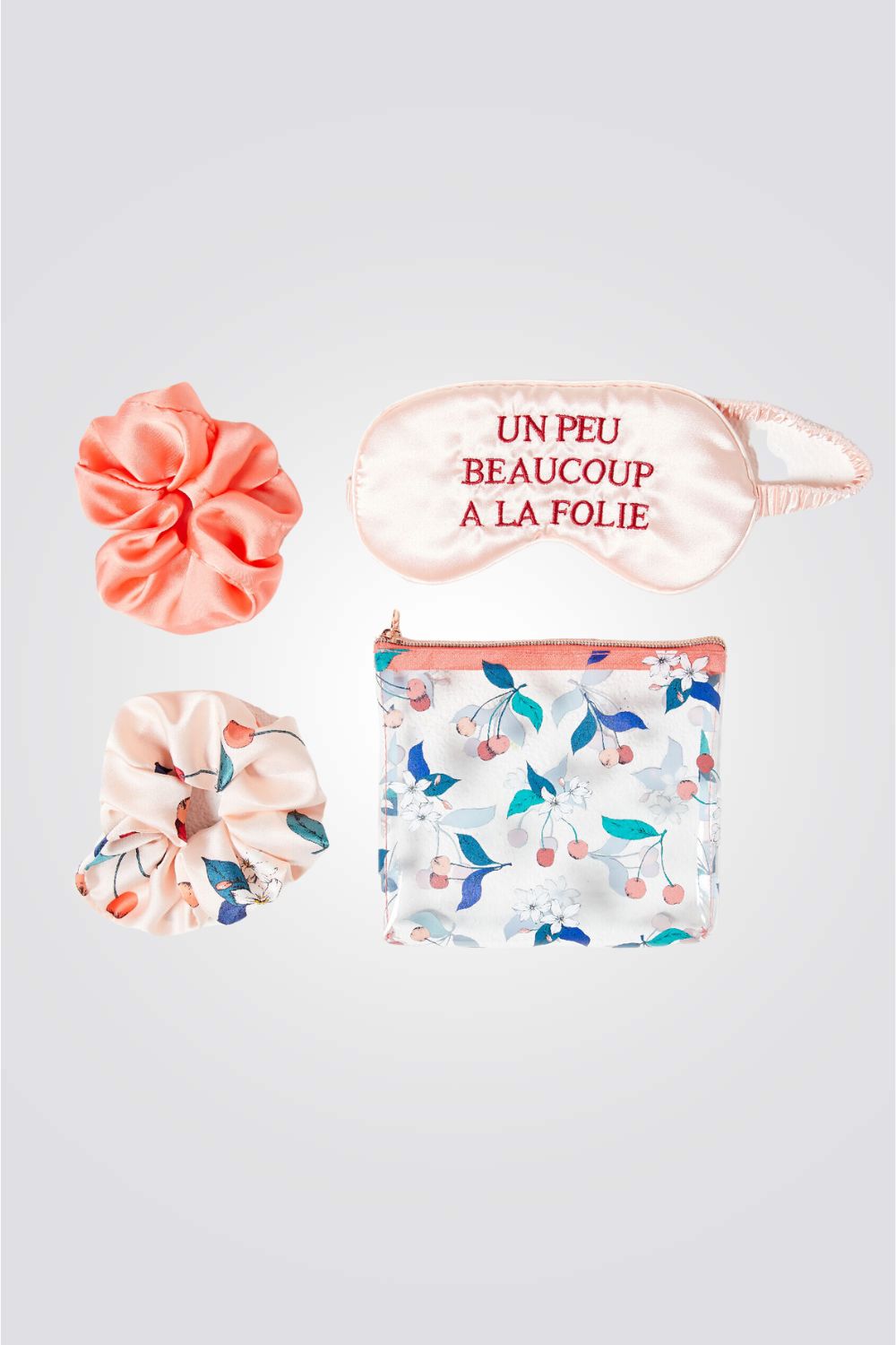 מארז אביזרי שינה מבית המותג הצרפתי ETAM המכיל כיסוי עיניים רך ועדין, שתי עוגיות גדולות לשיער ותיק רחצה קטן ומתוק.