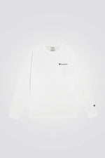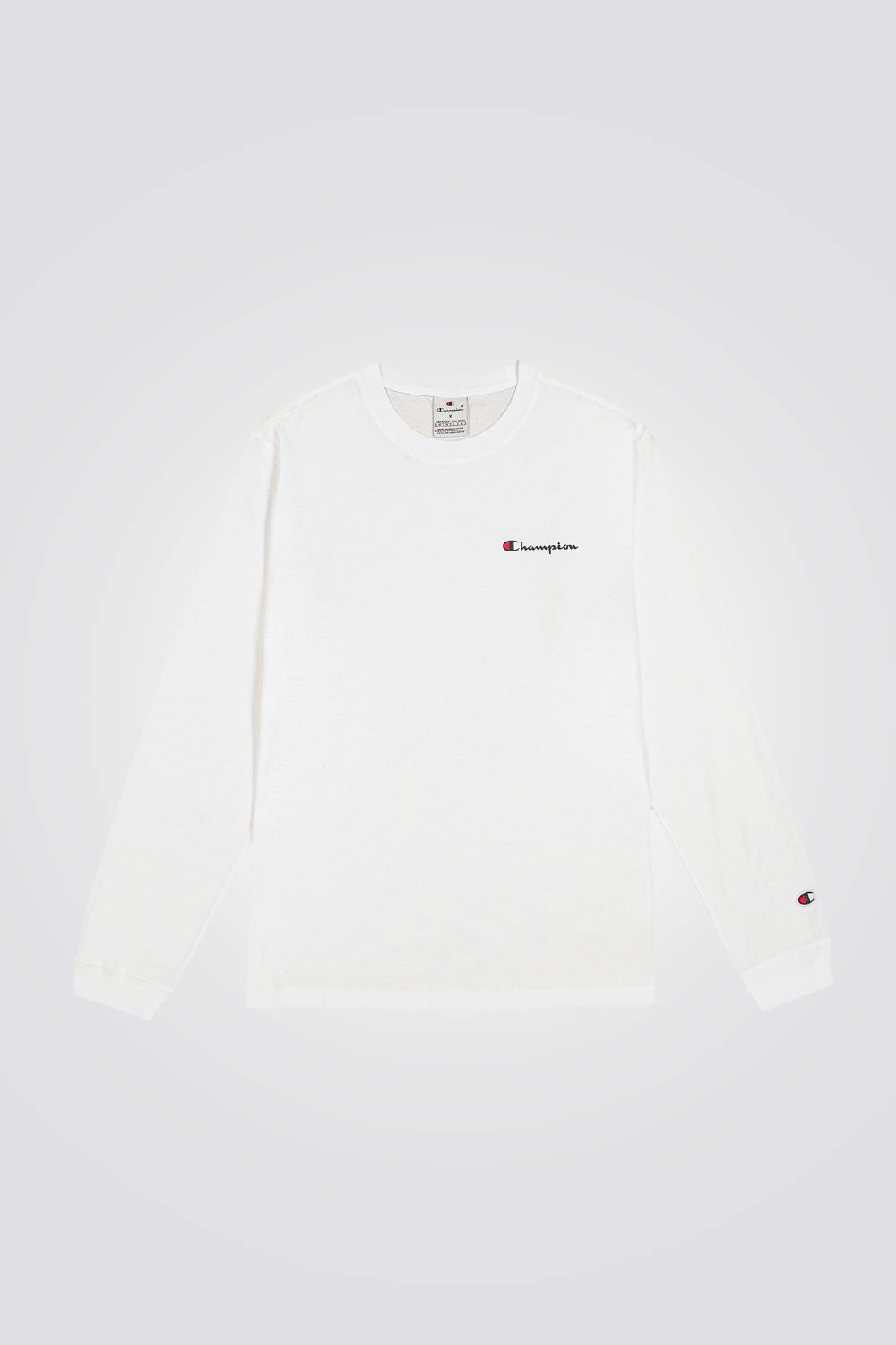 טישירט לגברים מבית המותג CHAMPION, בצבע לבן עם שרוולים ארוכים עם סיומת גומי ולוגו המותג , וצווארון עגול, מתאים ליום יום ולכל לוק.