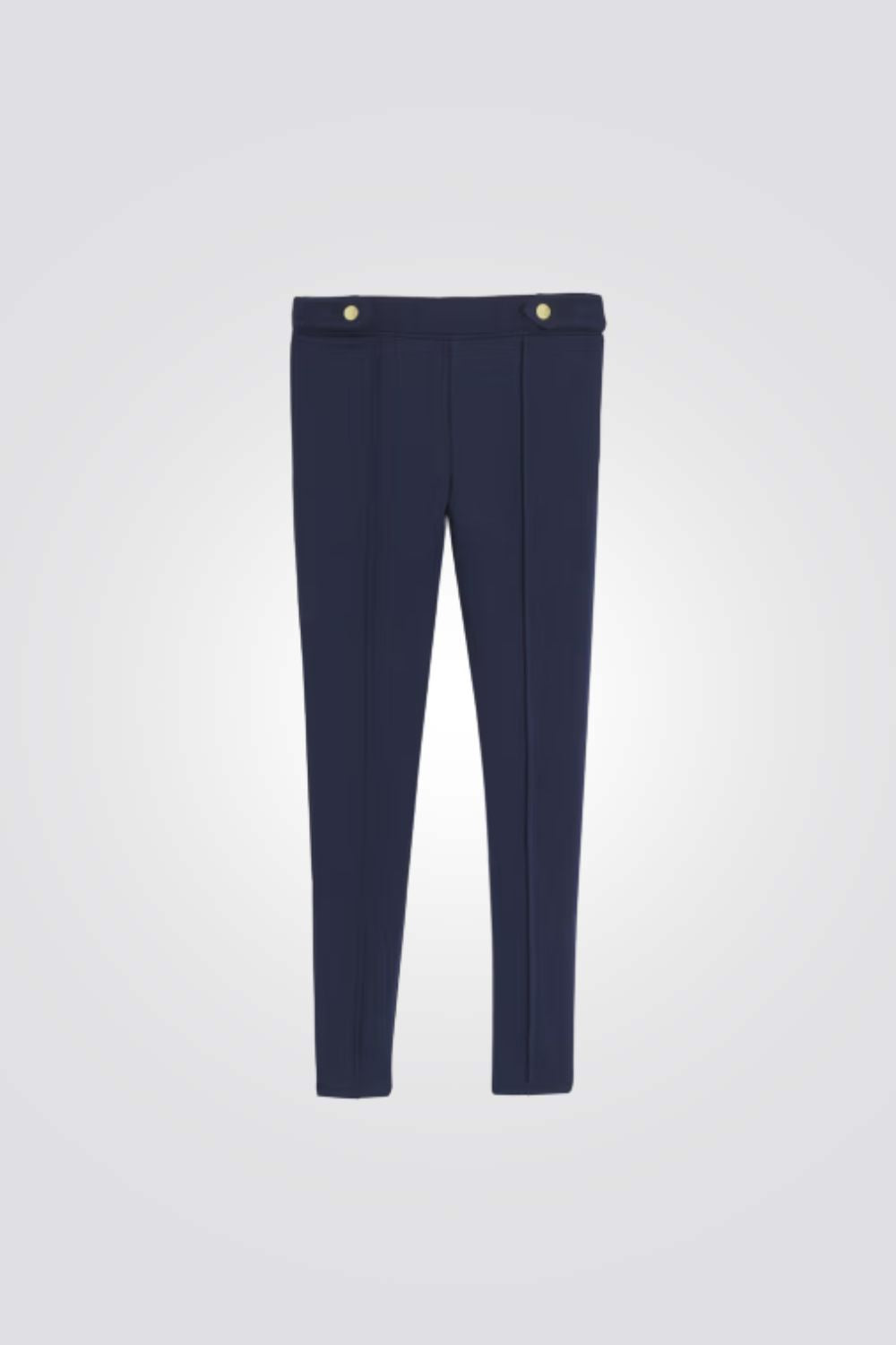 טייץ עם שיק מבית המותג OKAIDI - עם קפלים מסומנים בחזית וצמדנים מוזהבים במותניים.