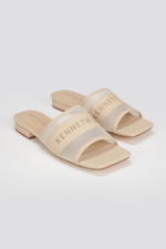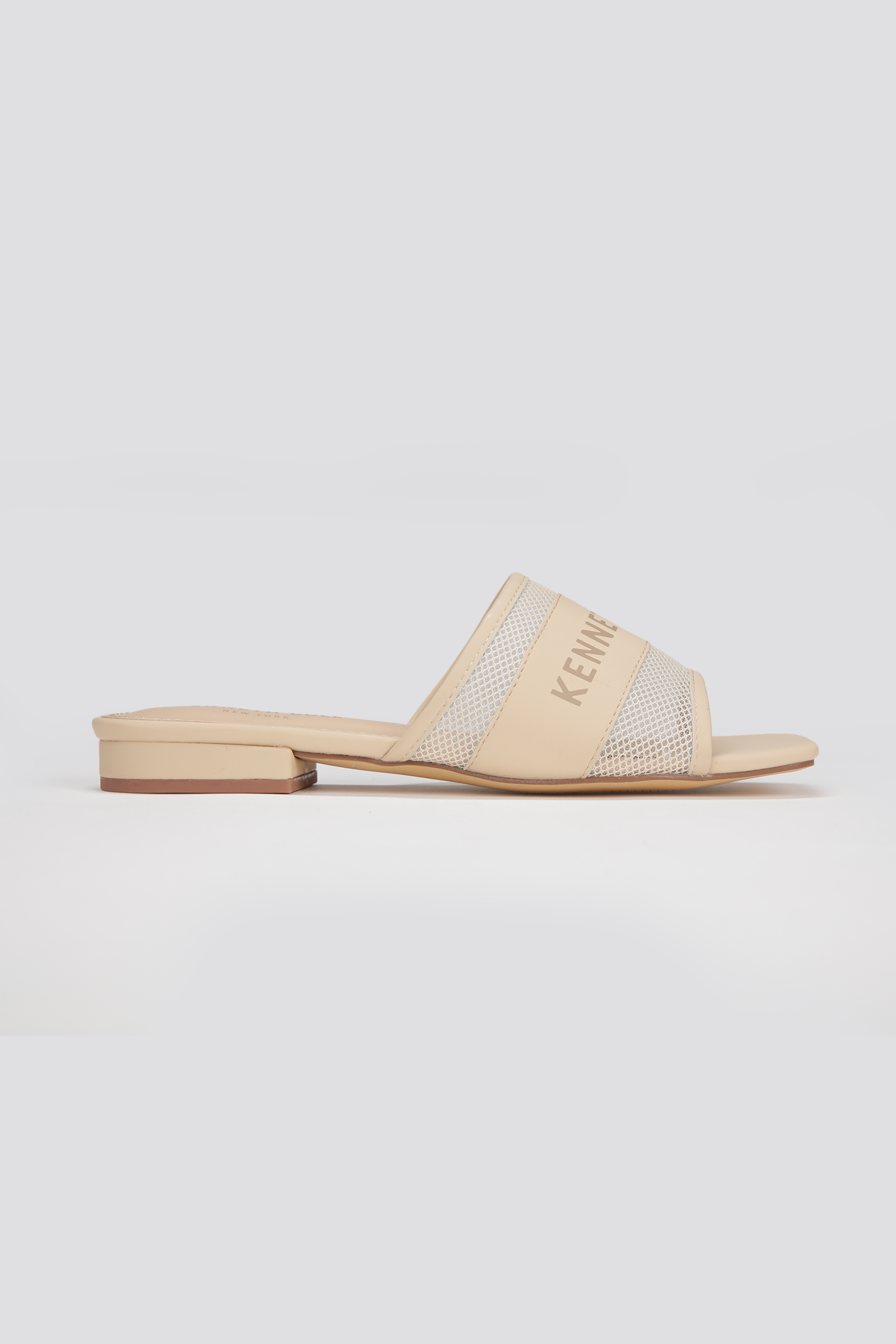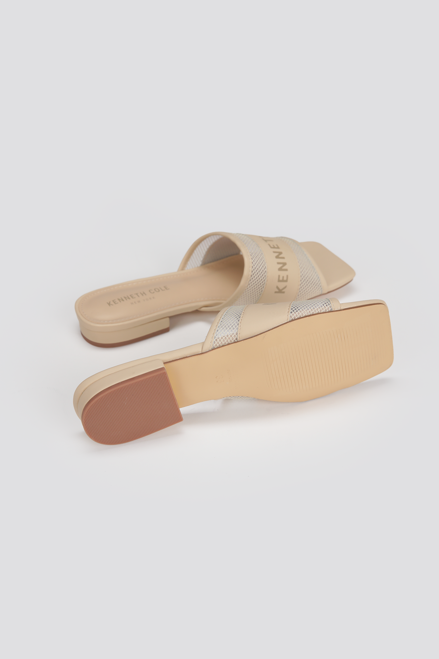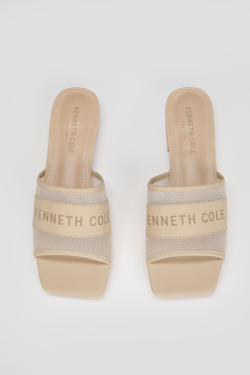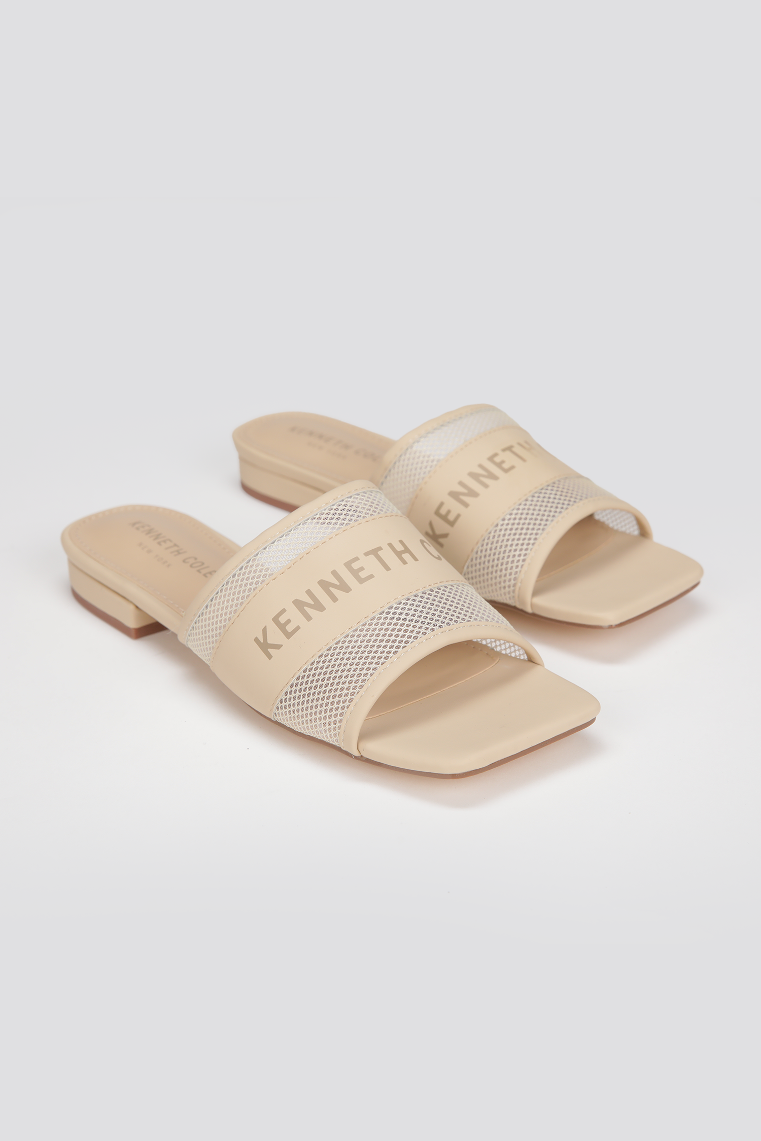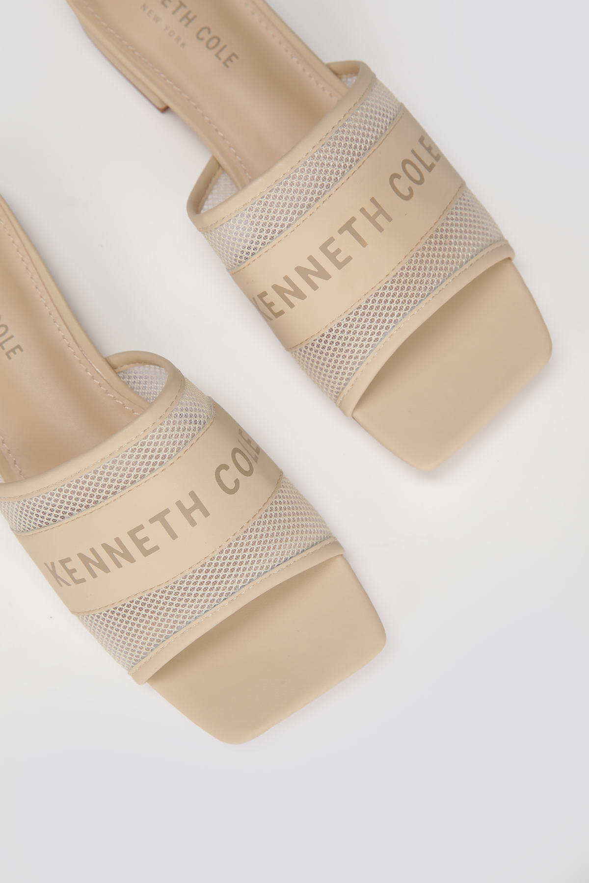 סנדל שטוח מבית המותג KENNETH COLE לנשים, בעל חלק עליון רצועה מרשת המחזיקה את הרגל ועליה הטבעת לוגו המותג וסוליה חיצונית מגומי.