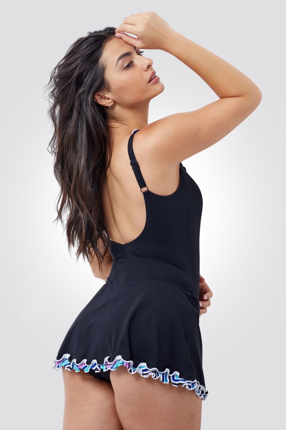 בגד ים שלם עם קאפים רכים וחצאית מובנית בעיטור בד צבעוני . ניתן לכוונן את החצאית בעזרת השרוכים. כתפיות מתכווננות להתאמה אישית, הדוגמנית לובשת מידה 38, הרכב בד 28% פוליאמיד 72% אלסטן