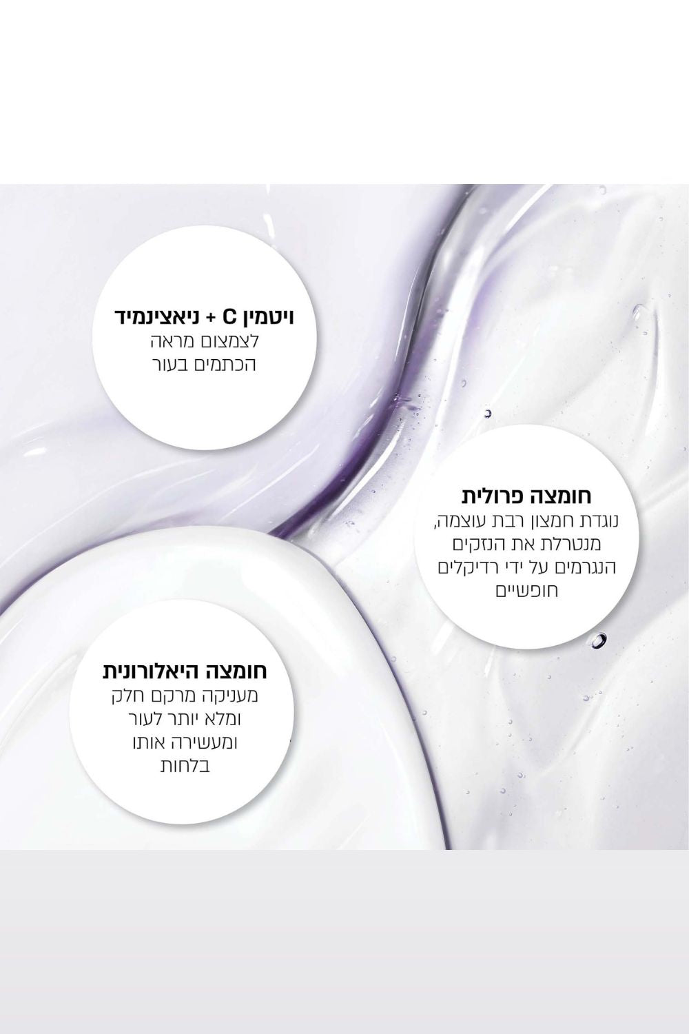 עם שילוב משולש ועוצמתי של חומצה היאלורונית, ויטמין C + ניאצינמיד וחומצה פרולית.