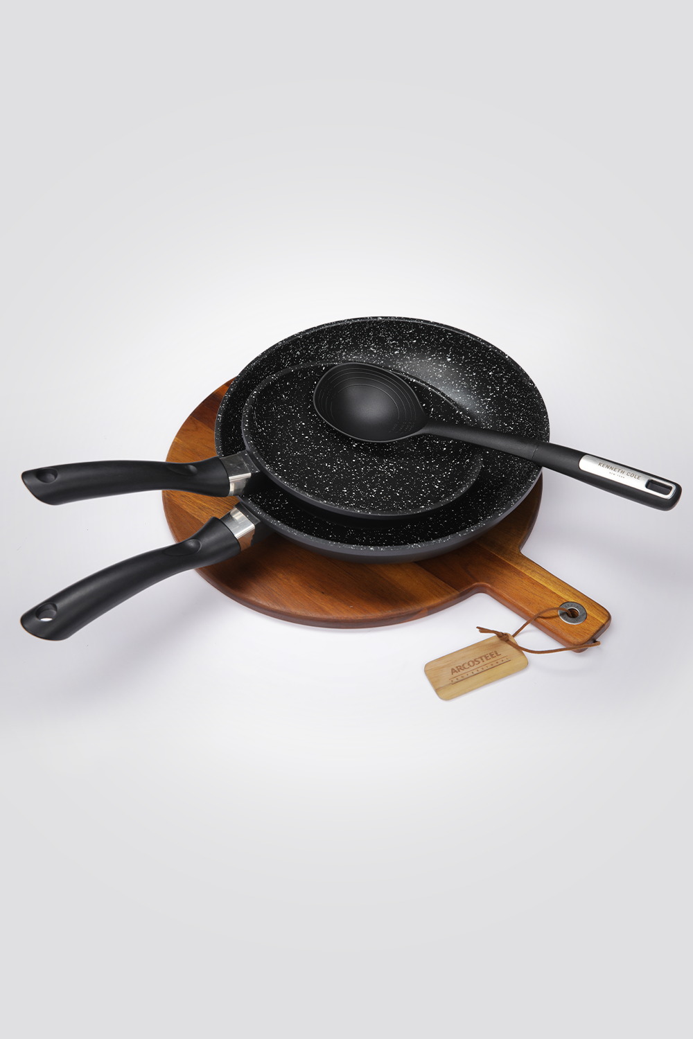 מחבתות 20 ו-28 ס"מ מסדרת STONE . מחבת מבית המותג ARCOSTEEL עשויה מיציקת אלומיניום ומצופה בציפוי נון סטיק בעל עמידות גבוהה בפני שריטות, ושחיקה , עמידות בחום גבוהה, ציפוי פנימי שמורכב מ3 שכבות נון סטיק, קלה לניקוי ועמידה לאורך זמן . ידית אורגונומית שמתאימה בצורה מדויקת למבנה כף היד וקלה לתפעול, מתאימה לכלל סוגי הכיריים כולל אינדוקציה וניתנת לניקוי במדיח כלים