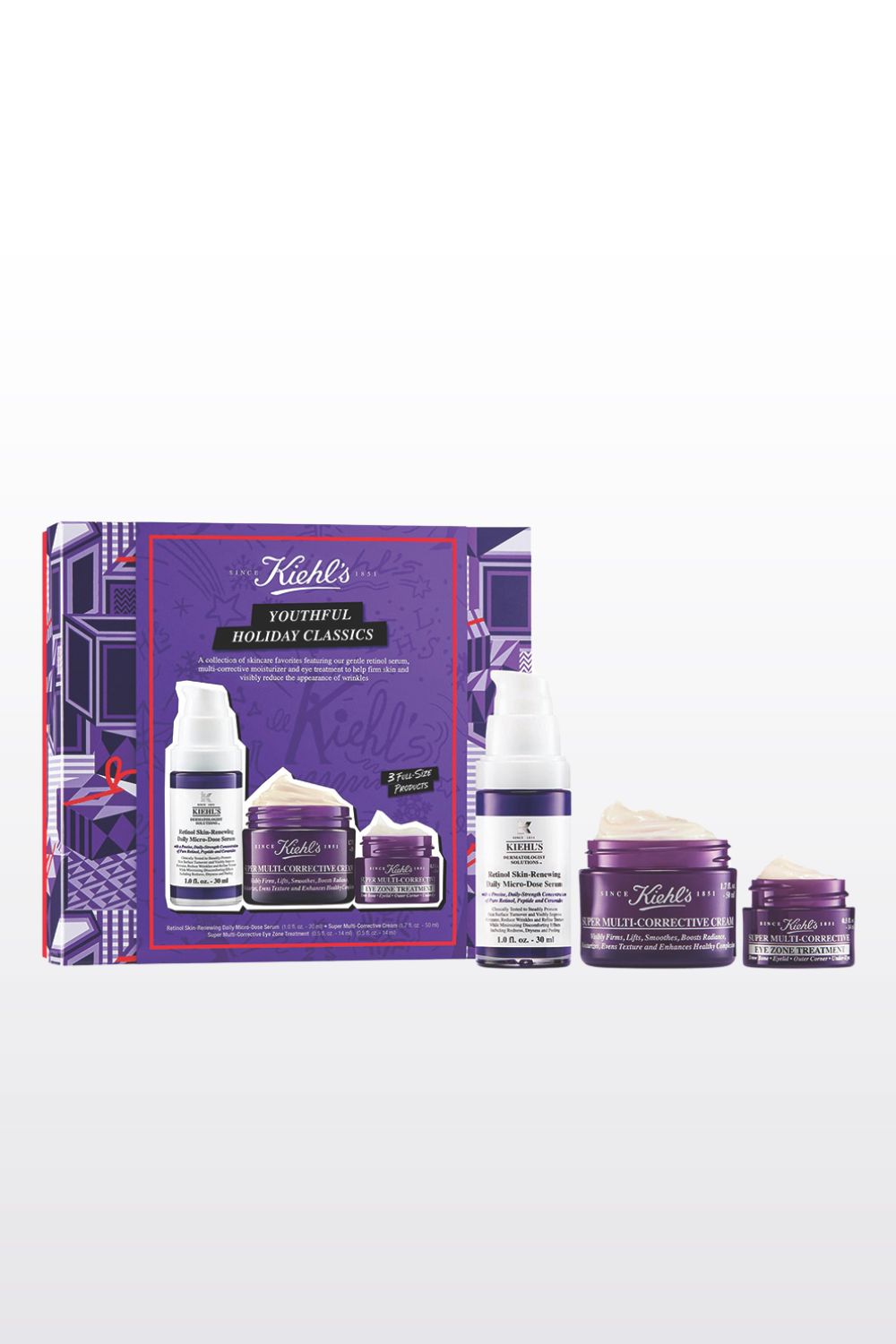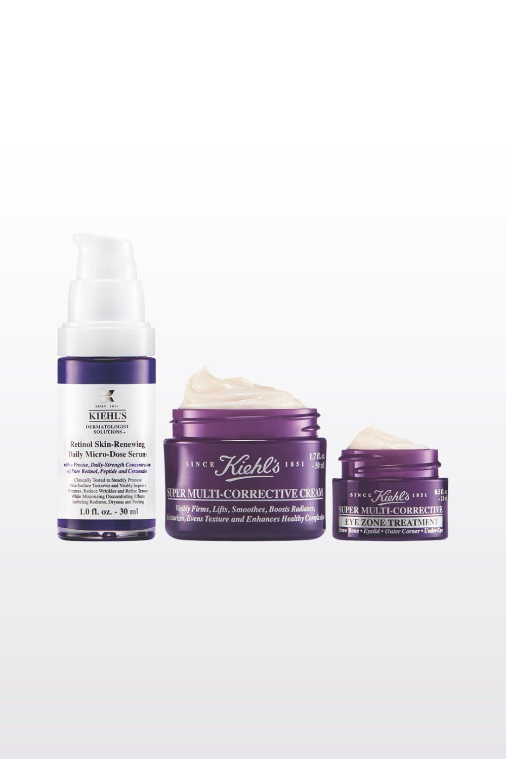 המארז האולטמיטיבי של קיל'ס לטיפול בסימני הגיל. המארז מכיל: סרום מיקרו-רטינול יומי לחידוש מראה העור 30 מ"ל: תמצית יומית מסייעת לחיזוק מראה העור המכילה מינון מדוייק של רטינול טהור, פפטיד וסרמידים נבדק קלינית/מחקרית* כמסייע בחידוש תאי העור באופן יציב וקבוע ושיפור נראה לעין של מיצוק העור, הפחתת מראה הקמטים ועידון מרקם העור תוך הפחתת תופעות אי נוחות לעור לרבות מראה אדמומי, יובש וקילוף העור. קרם לחות לפנים סופר מולטי קורקטיב 50 מ"ל: • קרם לחות המסייע בתיקון מראה העור, מכיל תמצית עץ אשור, חומצה היאלורונית וחומצה יסמונית • קרם לחות המעניק מראה עור מורם, מוצק ומסייע בחידוש מרקם העור • הקרם מסייע בהחלקת מראה הקמטים ובהגדרה מחדש של מראה קווי המתאר קרם עיניים סופר מולטי קורקטיב 14 מ"ל: קרם עיניים טיפולי מסדרת האנטי-אייג'ינג שהוכח קלינית כמסייע בהרמה, החלקה והבהרת אזור העיניים לטשטוש סימני הזדקנות גלויים סביב עצם הגבה, העפעף, צידי ומתחת לעין. ללא פרבנים וללא ריח.