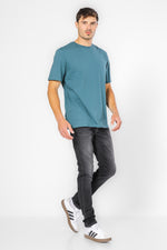 חולצה העשויה מבד סינגל ג’רסי נעים בגזרה משוחררת עם שרוולים קצרים וצווארון עגול.