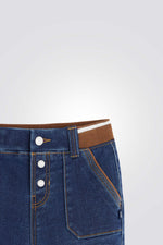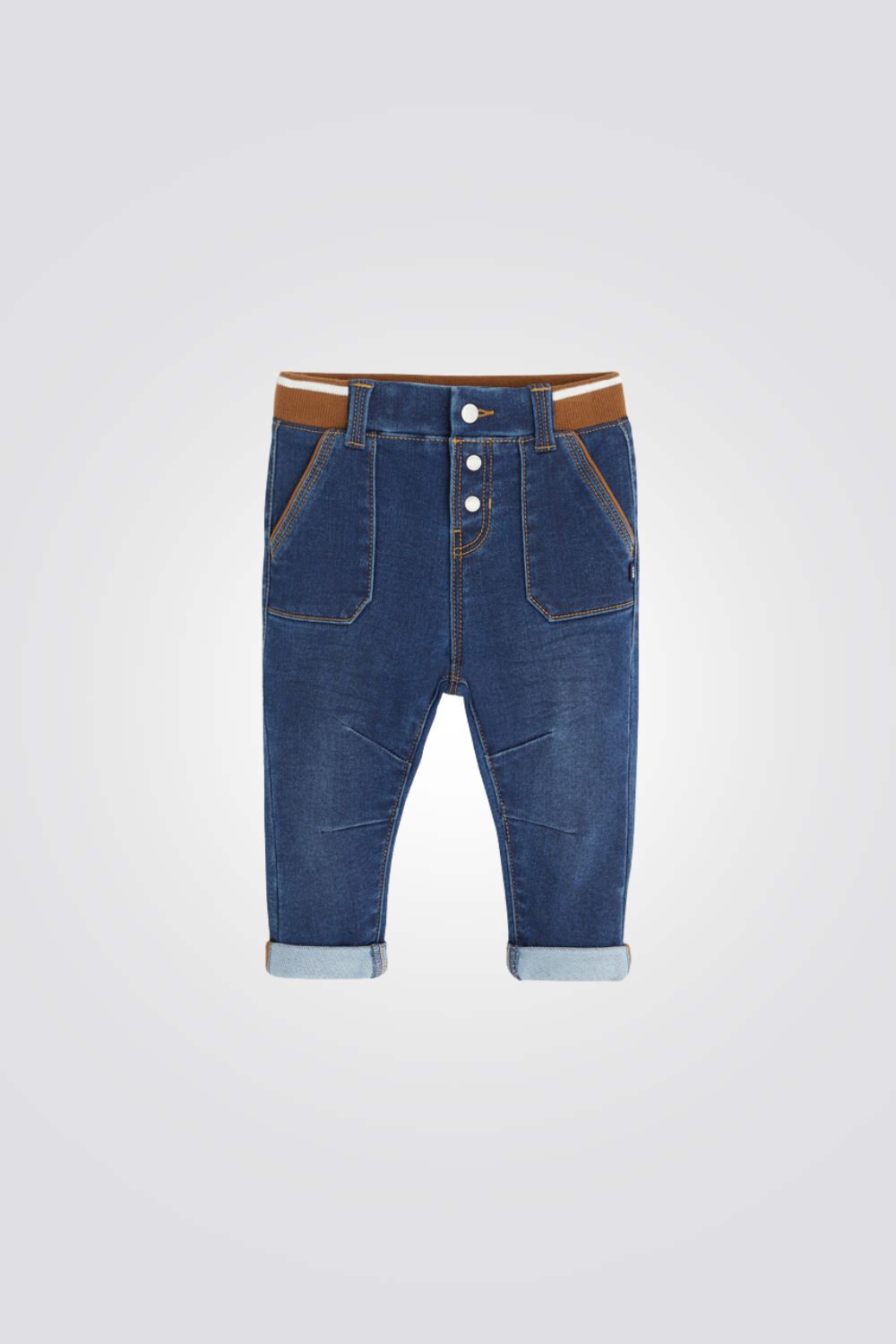 מכנסי ג'ינס לתינוקות מבית המותג OBAIBI, עם רצועת מותן אלסטית בצבע חום וסגירת כפתור, וארבעה כיסים.