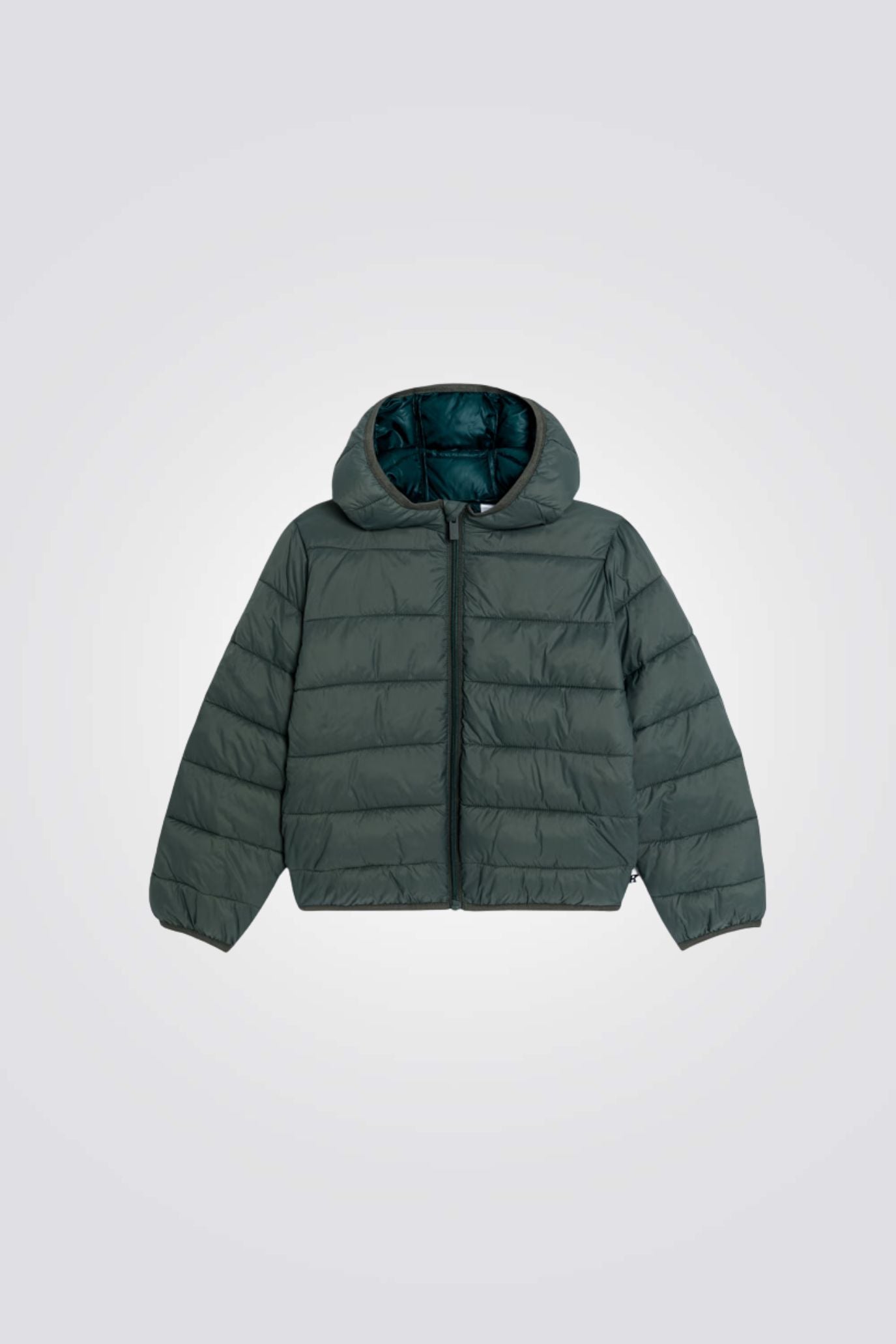 מעיל פוך לילדים מבית המותג OKAIDI, בצבע ירוק חאקי, מחמם במיוחד וקל משקל, עשוי מבד פוליאסטר מרופד,קפוצ'ון וסגירת רוכסן.