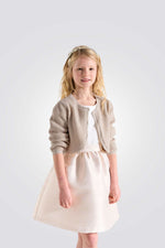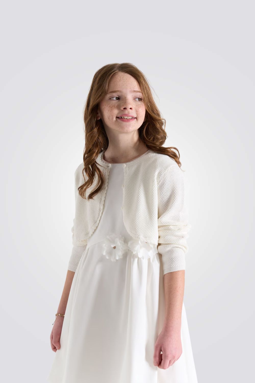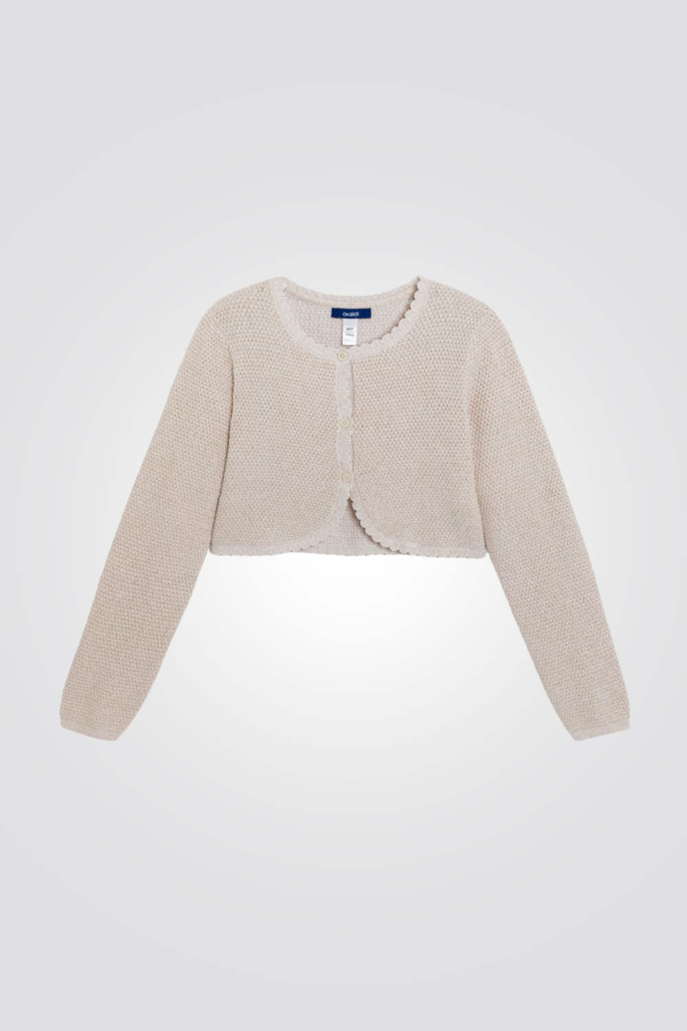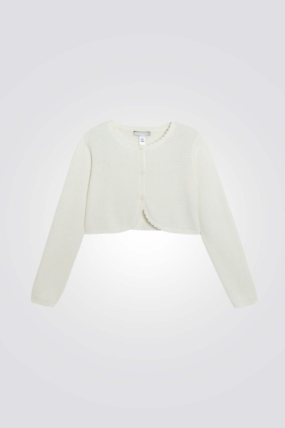 עליונית סריג לילדות מבית המותג OKAIDI, בצבעים לבן ובז', בגזרה קצרה עם סגירת כפתורים, צווארון עגול ושרוולים ארוכים.