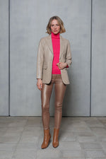 בלייזר מבית המותג KENNETH COLE לנשים בצבע בז', עשוי מעור איכותי בגימור מבריק קלות למראה אלגנטי, מעוצב בגזרה מחויטת, בעל שרוולים ארוכים עם סיומת כפתור, צווארון קלאסי, סגירת כפתר בחזית ושני כיסים דקורטיביים בצדדים.