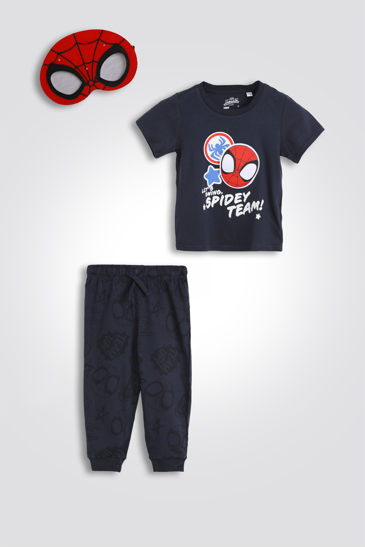 סט פיג'מת מעבר לילדים מבית המותג DELTA העשוי מבד נעים עם הדפס של ספיידרמן. חולצה עם צווארון עגול ושרוולים קצרים ומכנסיים ארוכים תואמים עם גומי במותניים ושרוכי קשירה. מגיע עם מסיכת שינה במוטיב ספיידרמן