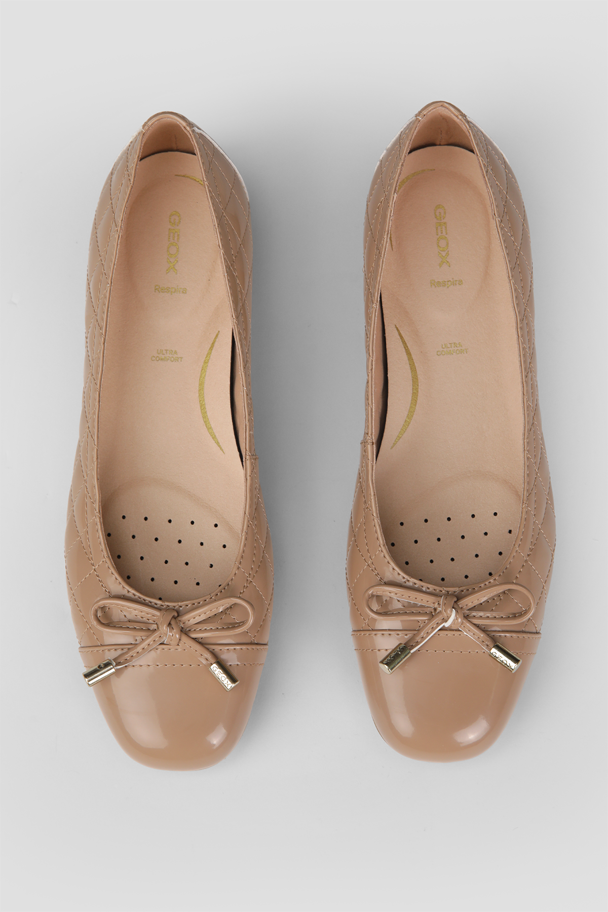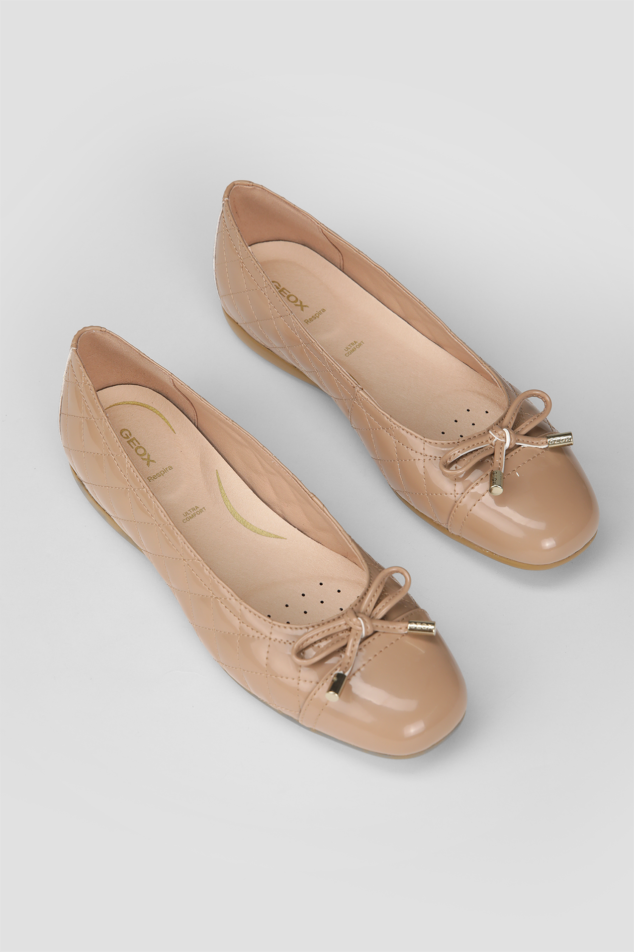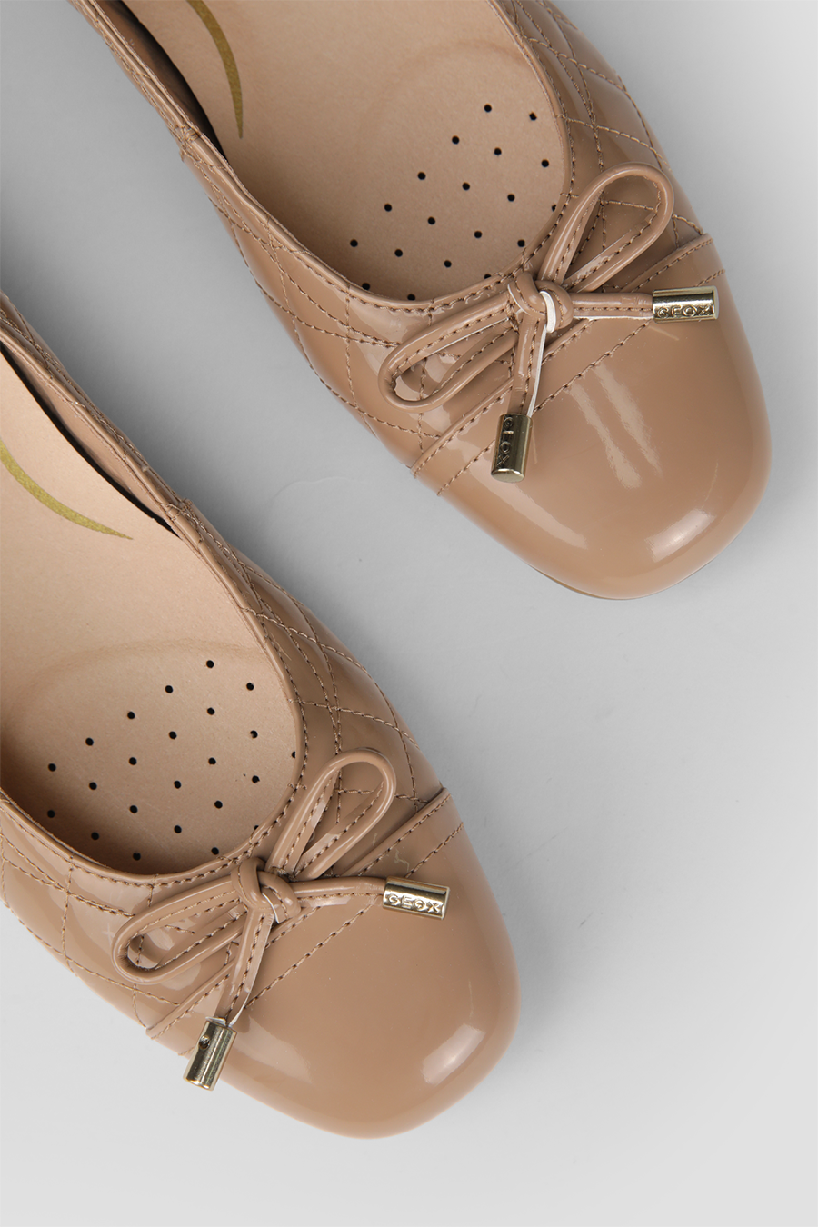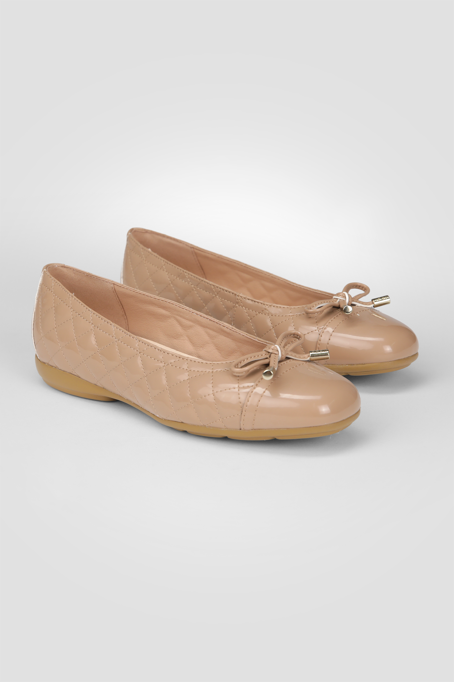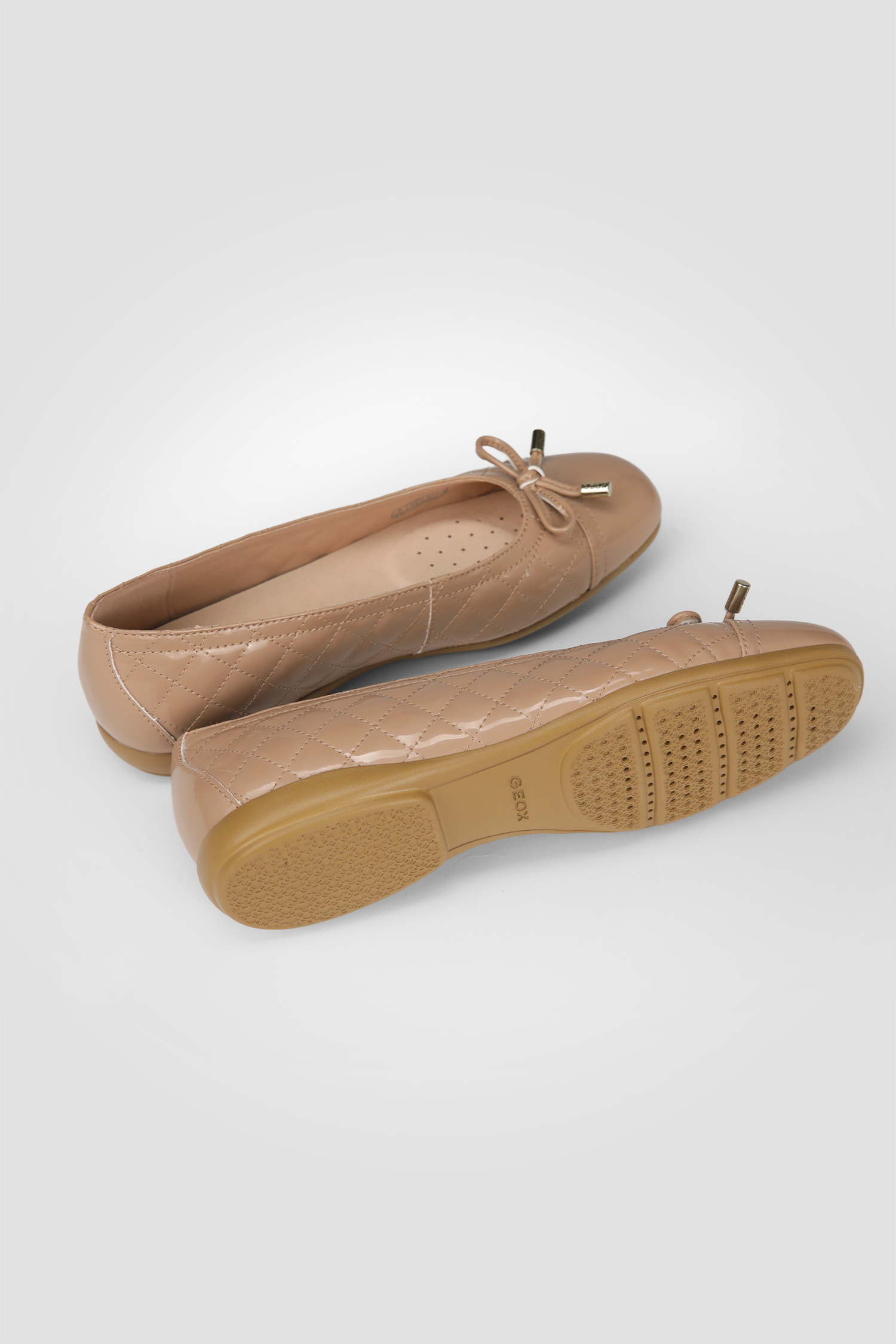 נעלי בובה לנשים מבית המותג GEOX, בסגנון מרופד ובגימור מבריק, קלות משקל, עם עיטור פפיון, נוחות ואידיאליות ליומיום.