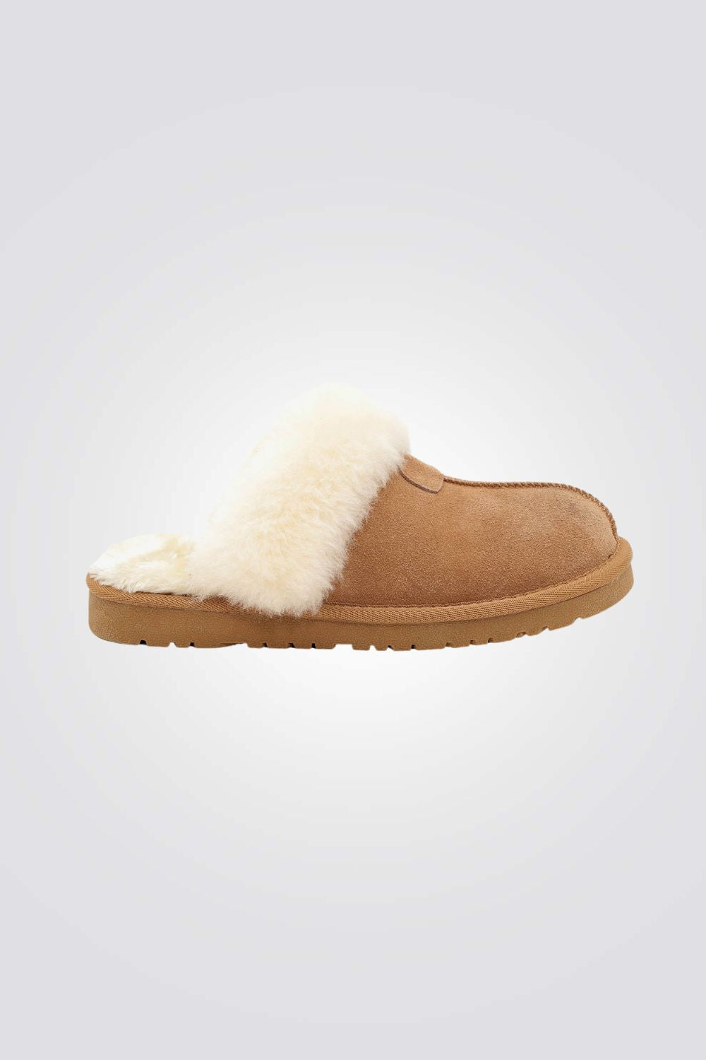 נעלי בית מבית המותג SEVENTYNINE בעלות בטנת דמוי פרווה רכה ונעימה . הכפכפים סגורים מקדימה באזור האצבעות, עם חרטום עגול ותפר חיצוני בולט ודקורטיבי במרכז הגפה. סוליית גומי בעובי בינוני, שמאפשרת נוחות ויציבות בכל צעד