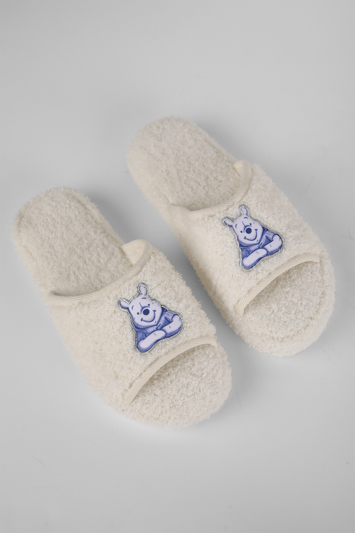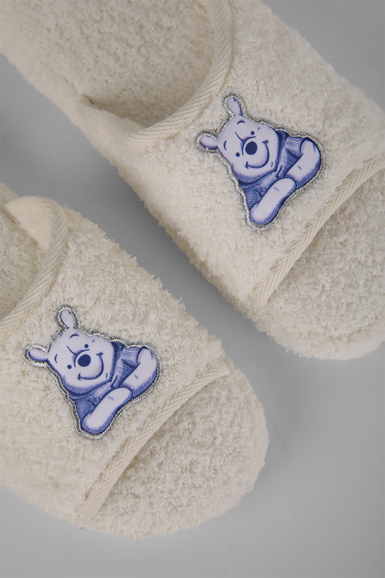 נעלי בית נעימים ונוחים לנשים מבית המותג DELTA העשויים מבד מגבת במוטיב פו הדב, עם רצועה עליונה רחבה לאחיזה טובה של הרגל
