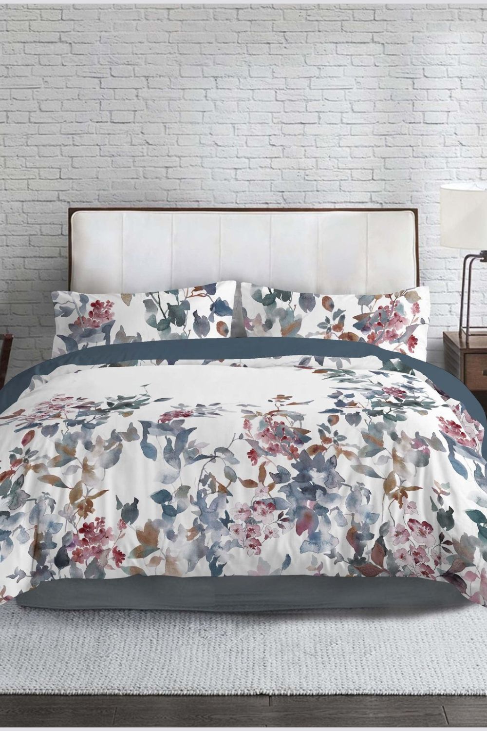 סט מצעים מפנק מבית KENNETH COLE היוקרתי, מעוצב בגווני כחול ואפור עם הדפסי עלים ופרחים, הרכב בד 100% כותנה סאטן.