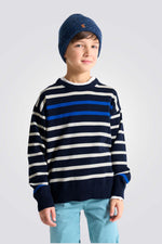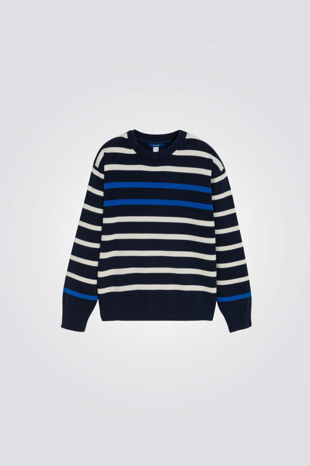 סוודר לילדים מבית המותג OKAIDI, בצבע כחול עם הדפס פסים, עשוי מבד מחמם ונעים, בגזרה מעט צמודה עם צווארון עגול .
