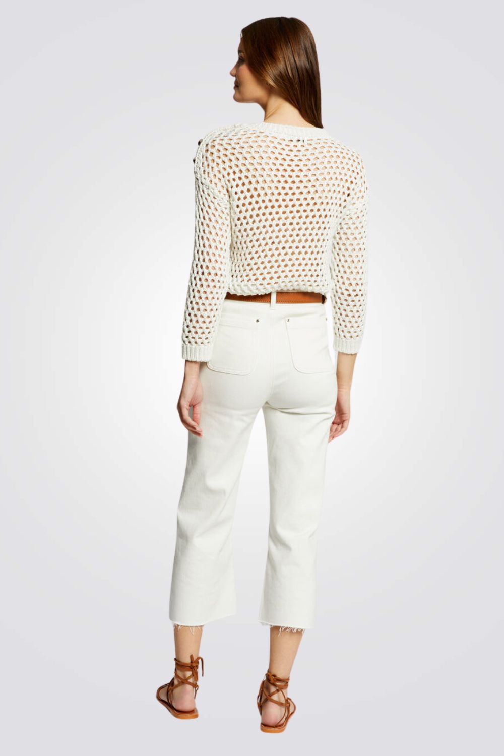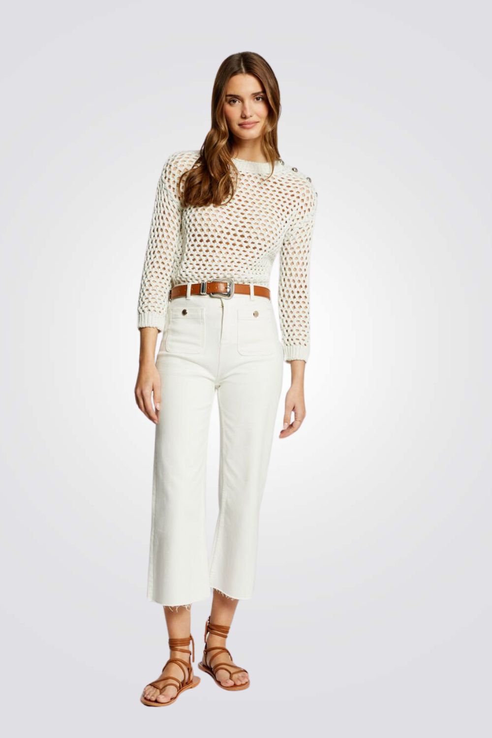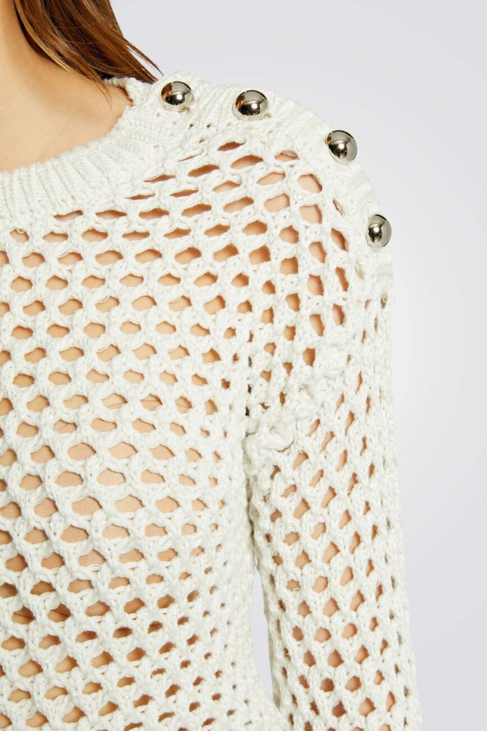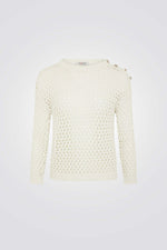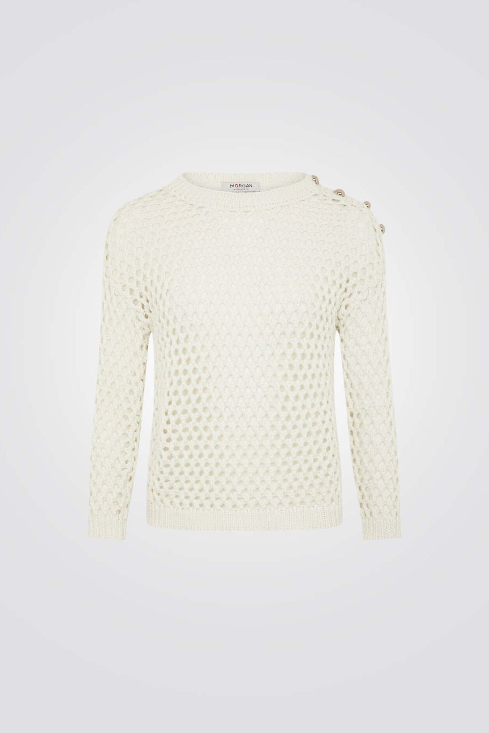חולצת סריג לנשים מבית המותג MORGAN, בסגנון סריגה פתוחה בצבע שנהב, בעלת שרוולים ארוכים, צווארון עגול וכפתורים דקורטיביים בכתפיים.