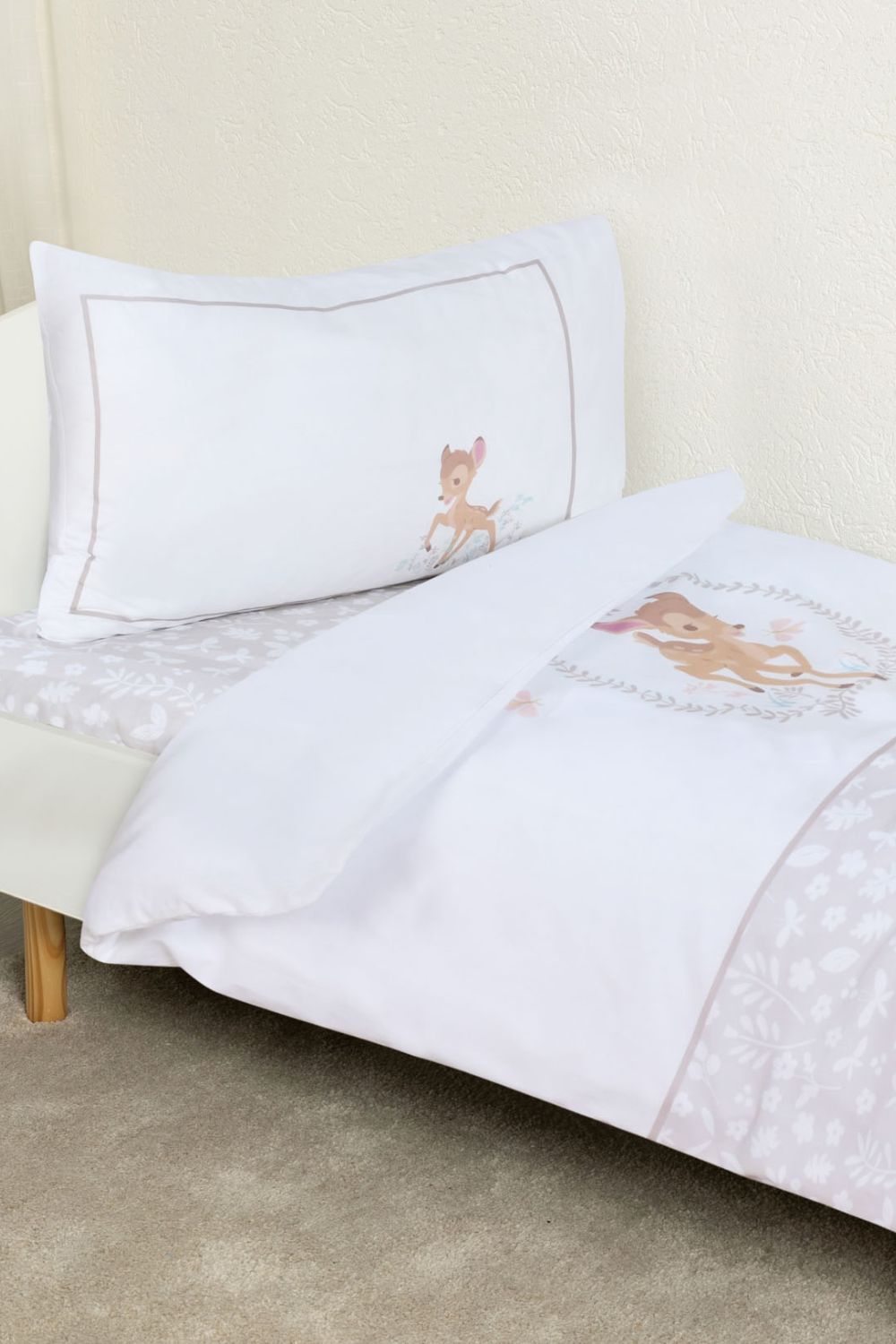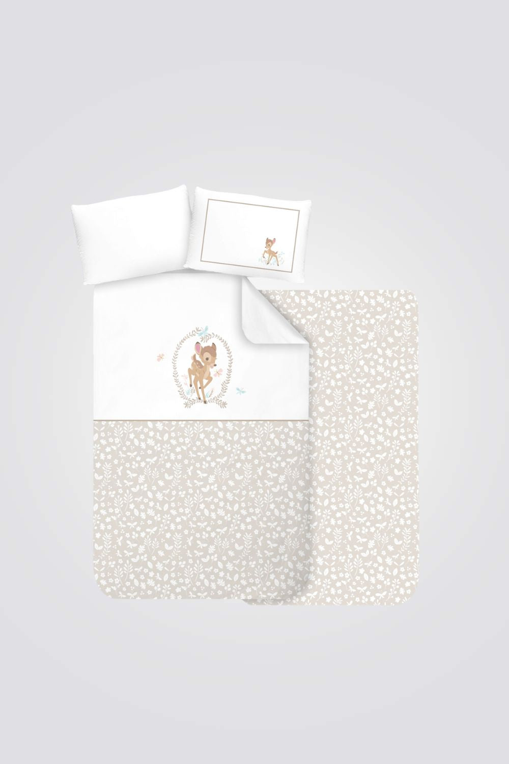 סט מצעים למיטת מעבר מבית המותג RED CHILLI, דגם BAMBI, מבד 100% כותנה עם הדפס במבי.