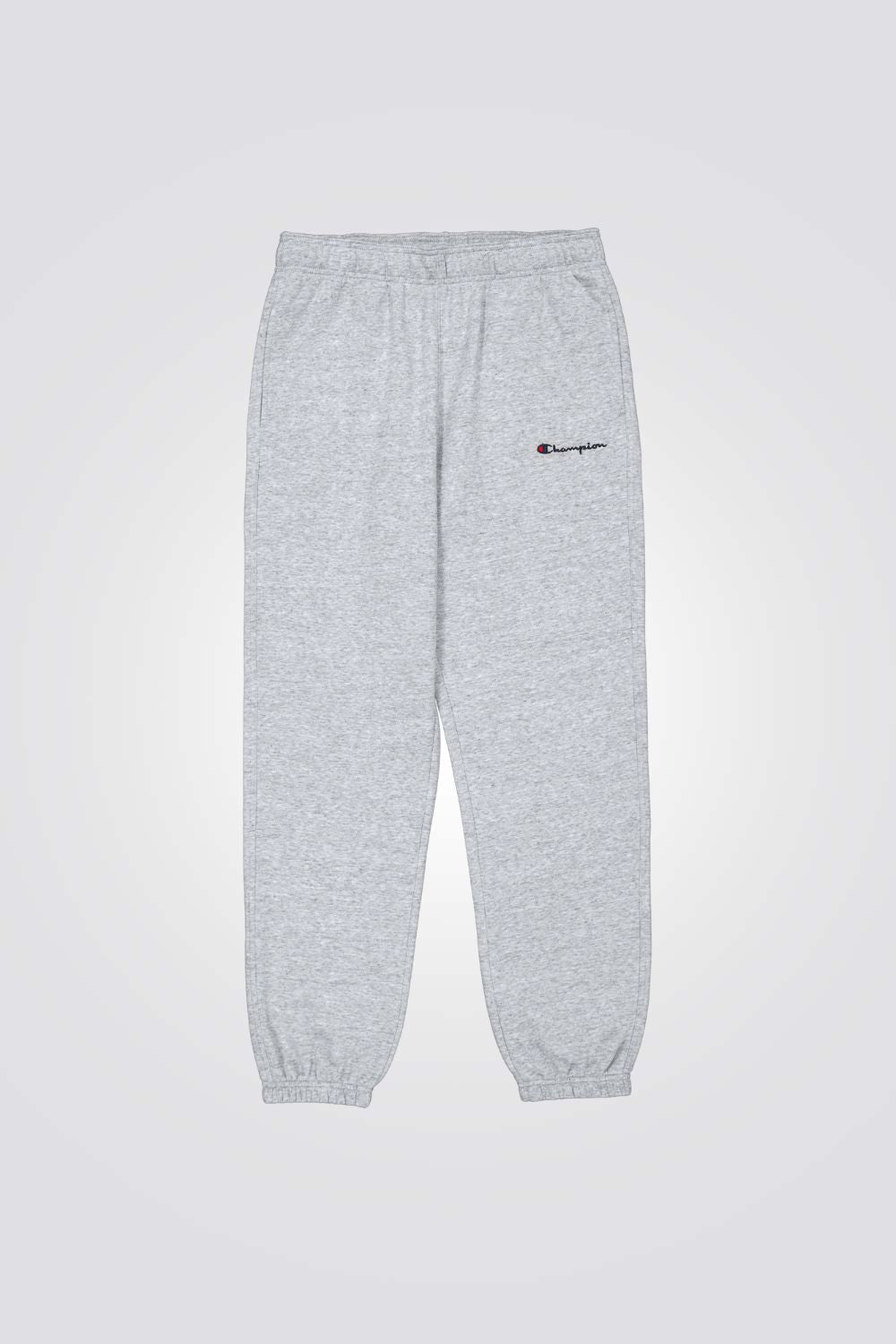 מכנסי טרנינג לגברים מבית המותג CHAMPION, בצבע אפור עם לוגו המותג, מותן אלסטית וסיומת גומי ברגליים.
