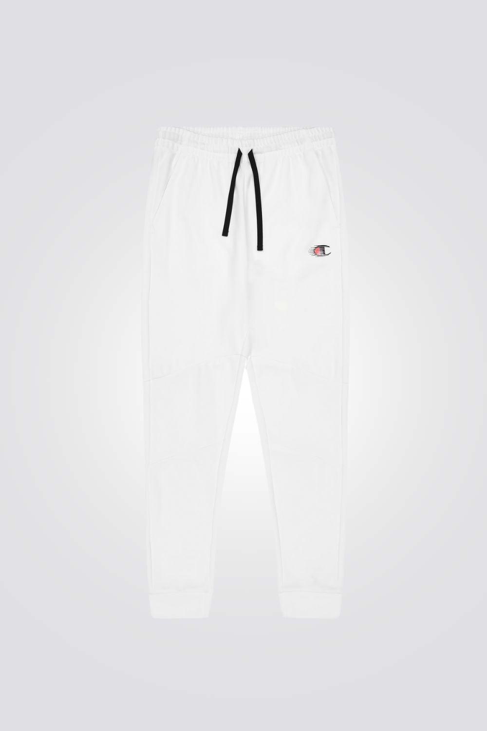 מכנסי טרנינג לגברים מבית המותג CHAMPION, בצבע לבן עם לוגו המותג, מותן אלסטית ושרוך קשירה, וסיומת גומי ברגליים.