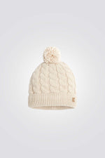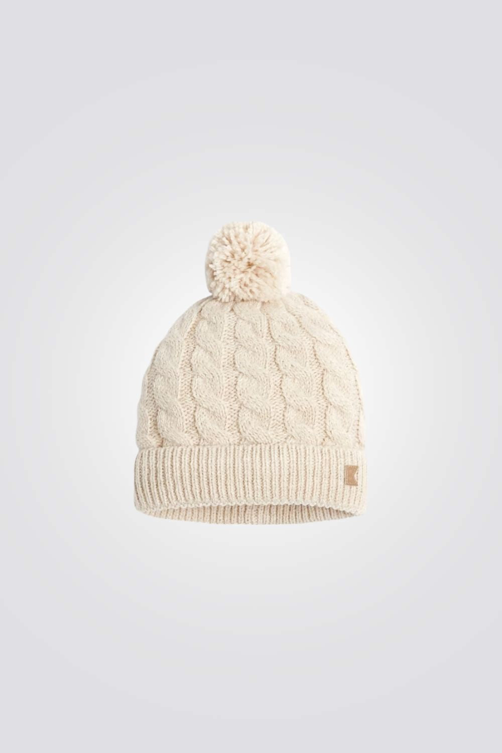 כובע צמר לילדות מבית המותג OKAIDI, בצבע בז' עם פונפון, מחמם ונעים ומגן על הראש והאוזניים מפני קור.