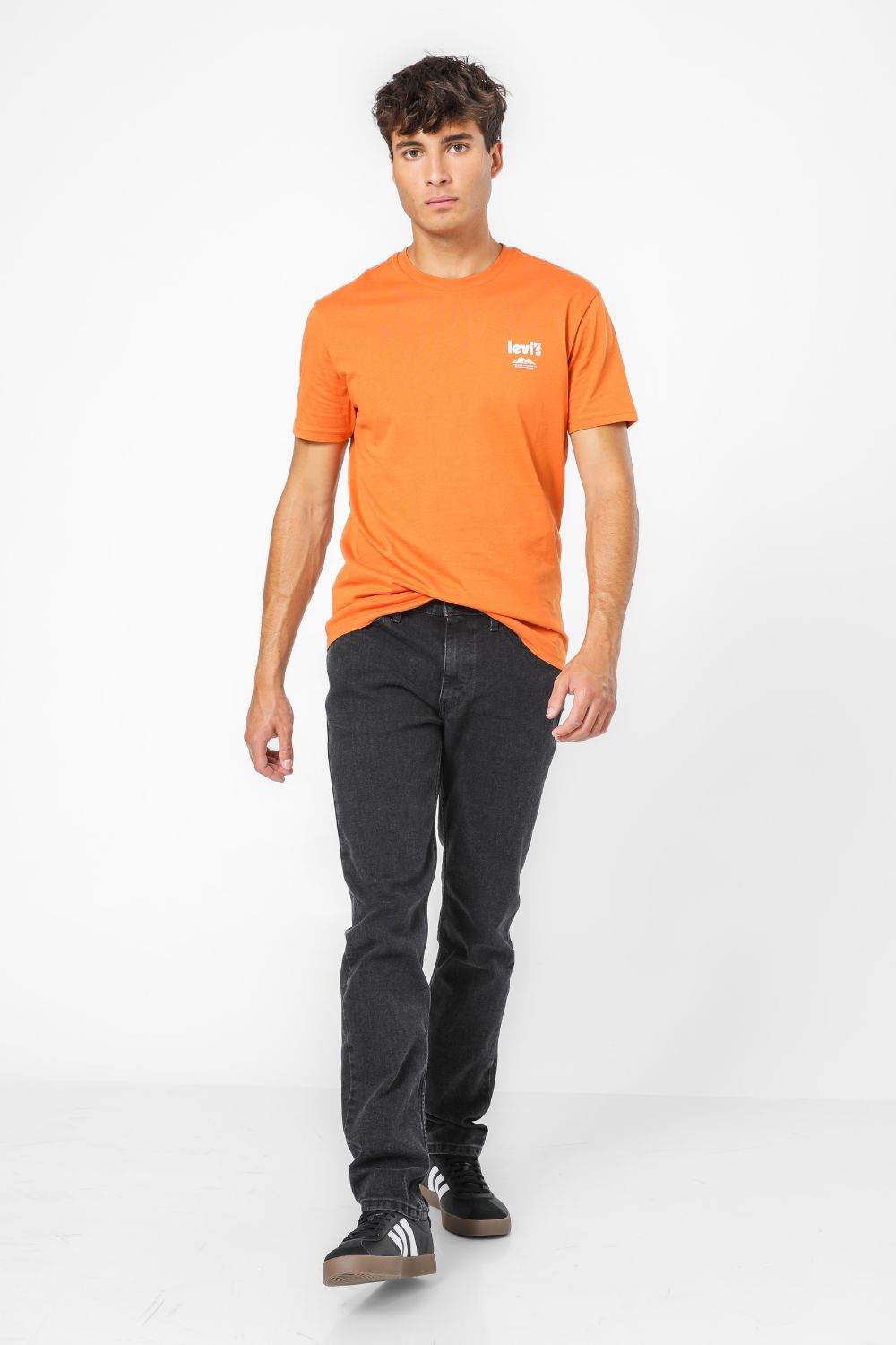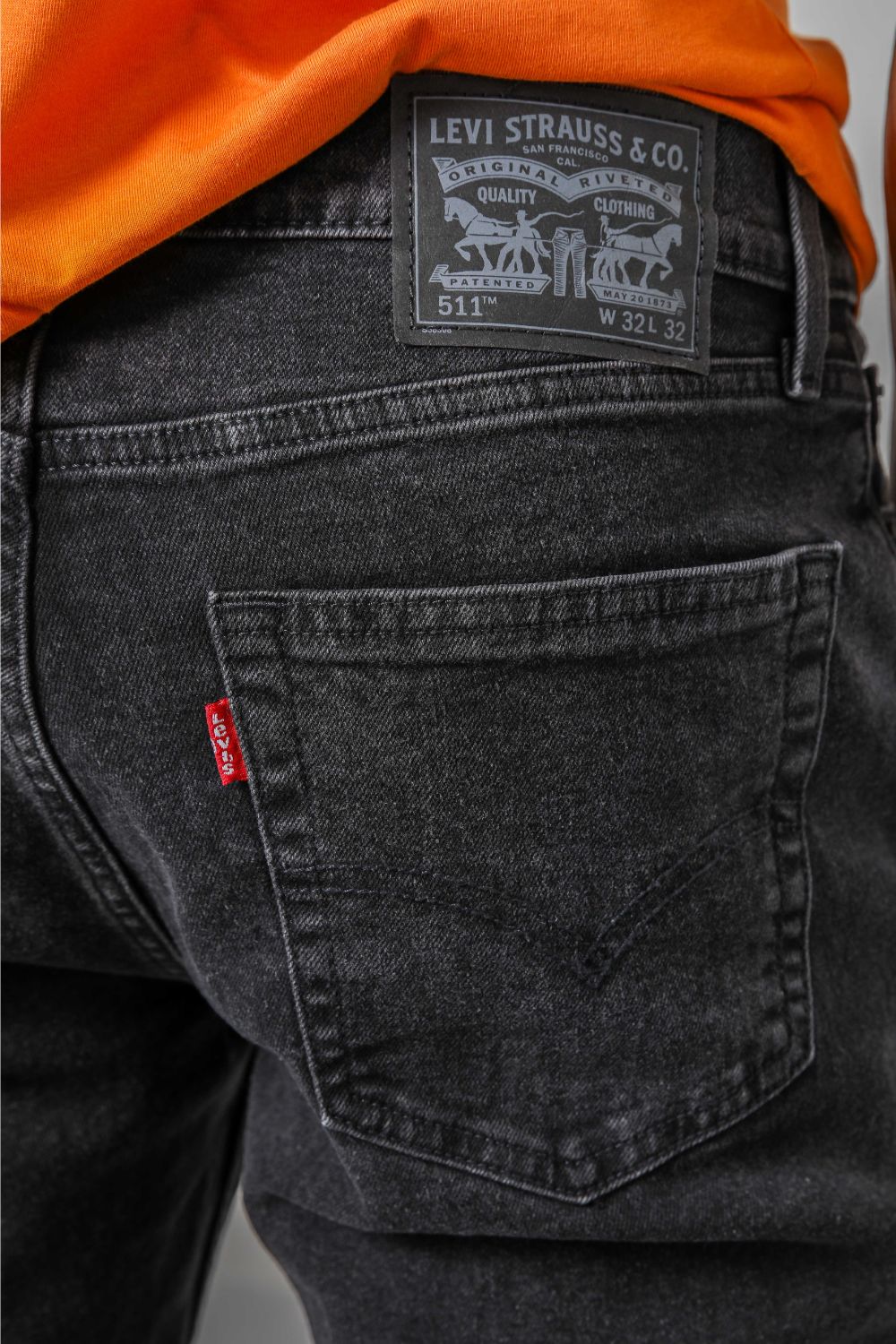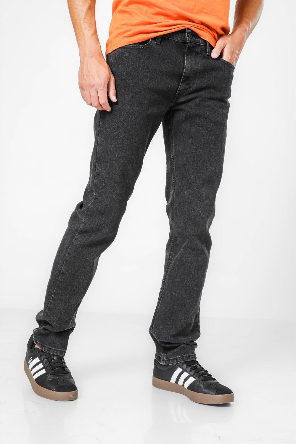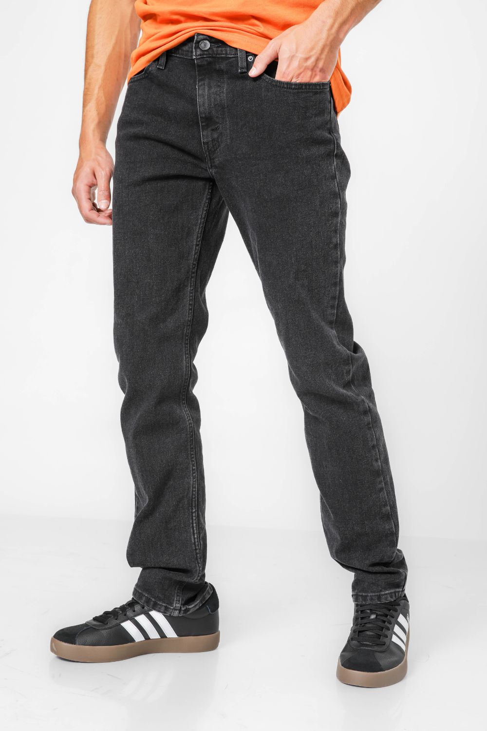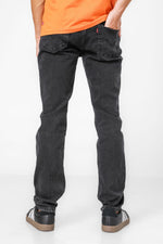 ג'ינס מבית המותג Levi's לגברים בצבע שחור, בגזרה צמודה, בגובה המותן, בעל רוכסן וכפתור לפתיחה וסגירה וכיסים קדמיים ואחוריים.