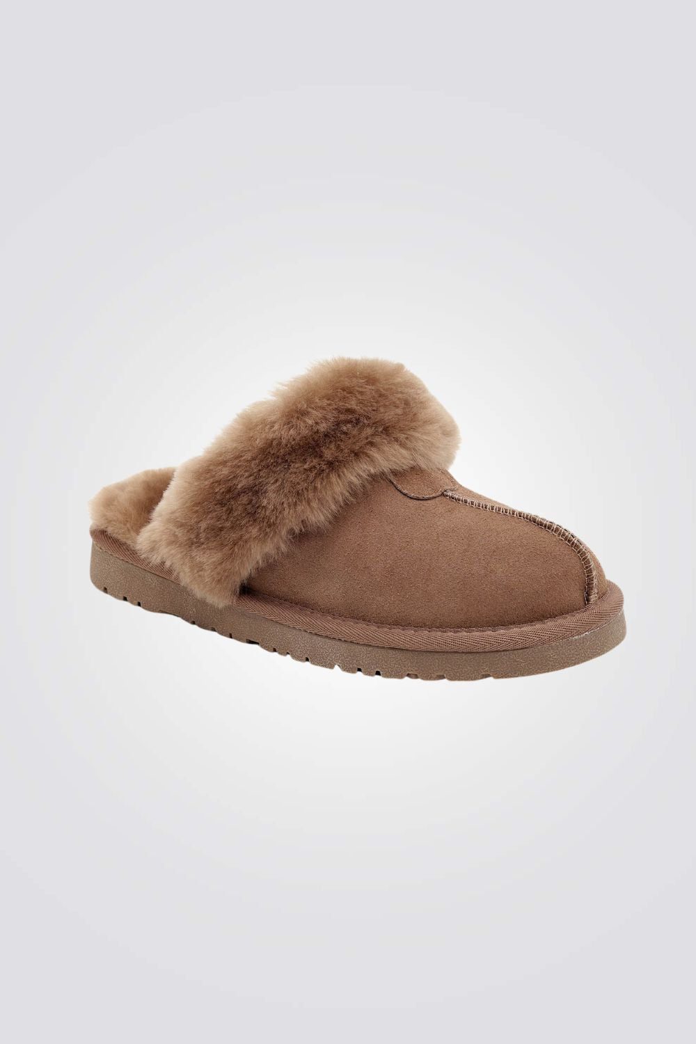 נעלי בית מבית המותג SEVENTYNINE בעלות בטנת דמוי פרווה רכה ונעימה . הכפכפים סגורים מקדימה באזור האצבעות, עם חרטום עגול ותפר חיצוני בולט ודקורטיבי במרכז הגפה. סוליית גומי בעובי בינוני, שמאפשרת נוחות ויציבות בכל צעד