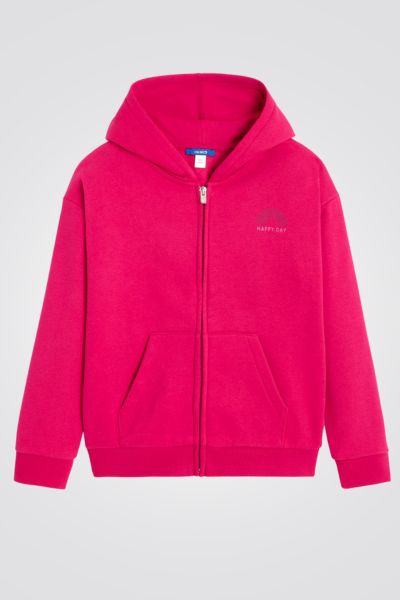 סווטשירט ילדות מבית המותג OKAIDI,עם רוכסן וקאפושון הדפס קשת בצבע ורוד,50% סיבים ממוחזרים.