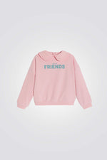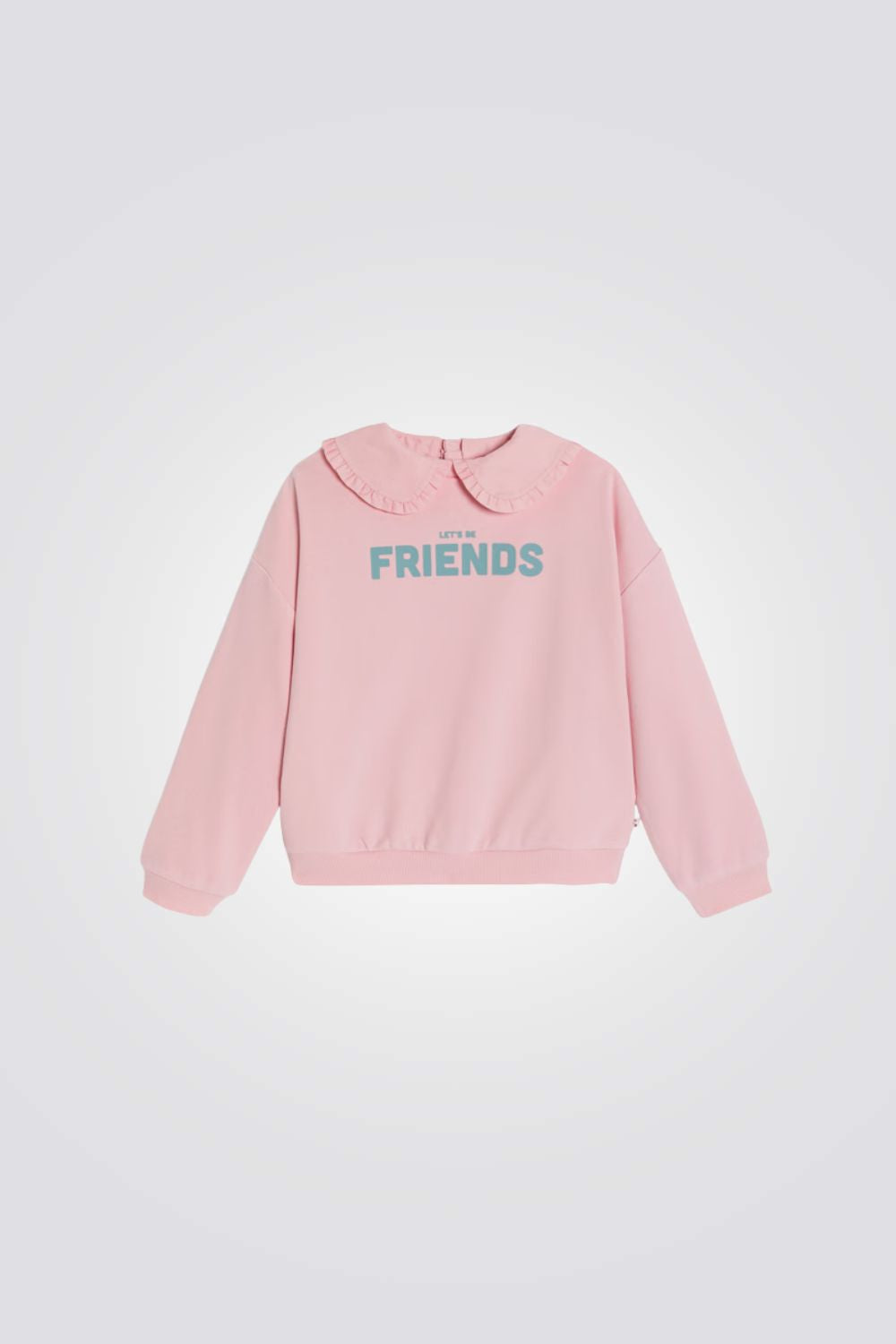 סווטשירט לילדות מבית המותג OKAIDI, בצבע ורוד עם הדפס בחזית, עשוי מבד ג'רזי רך ונעים, עם צווארון מעוצב המוסיף מראה אלגנטי.