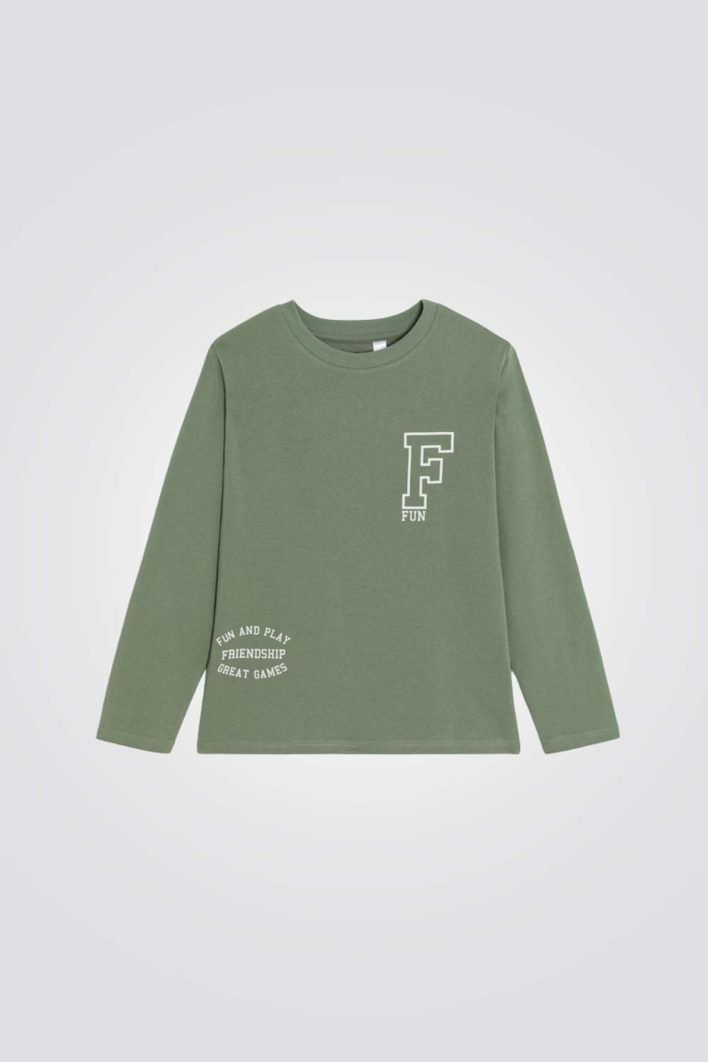 טישירט לילדים מבית המותג OKAIDI, עם שרוולים ארוכים, בצבע חאקי, עשויה מבד קליל ונעים ובגזרה נוחה, הדפס בחזית וצווארון עגול.