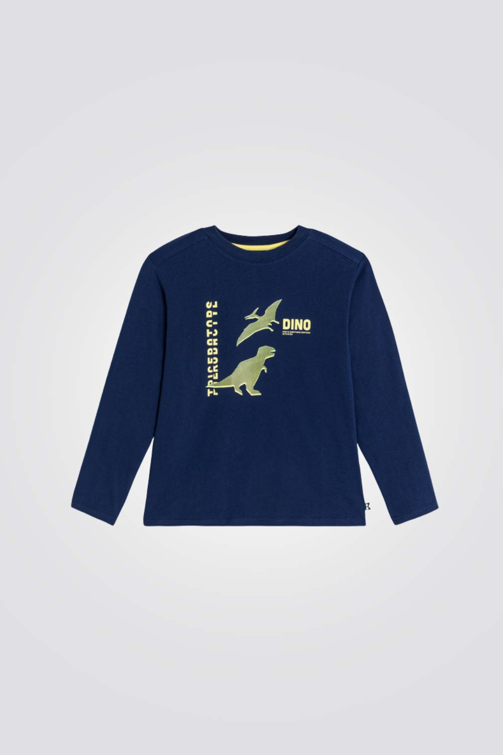 טישירט לילדים מבית המותג OKAIDI, עם שרוולים ארוכים, בצבע כחול, עשויה מבד קליל ונעים ובגזרה נוחה, הדפס בחזית וצווארון עגול.