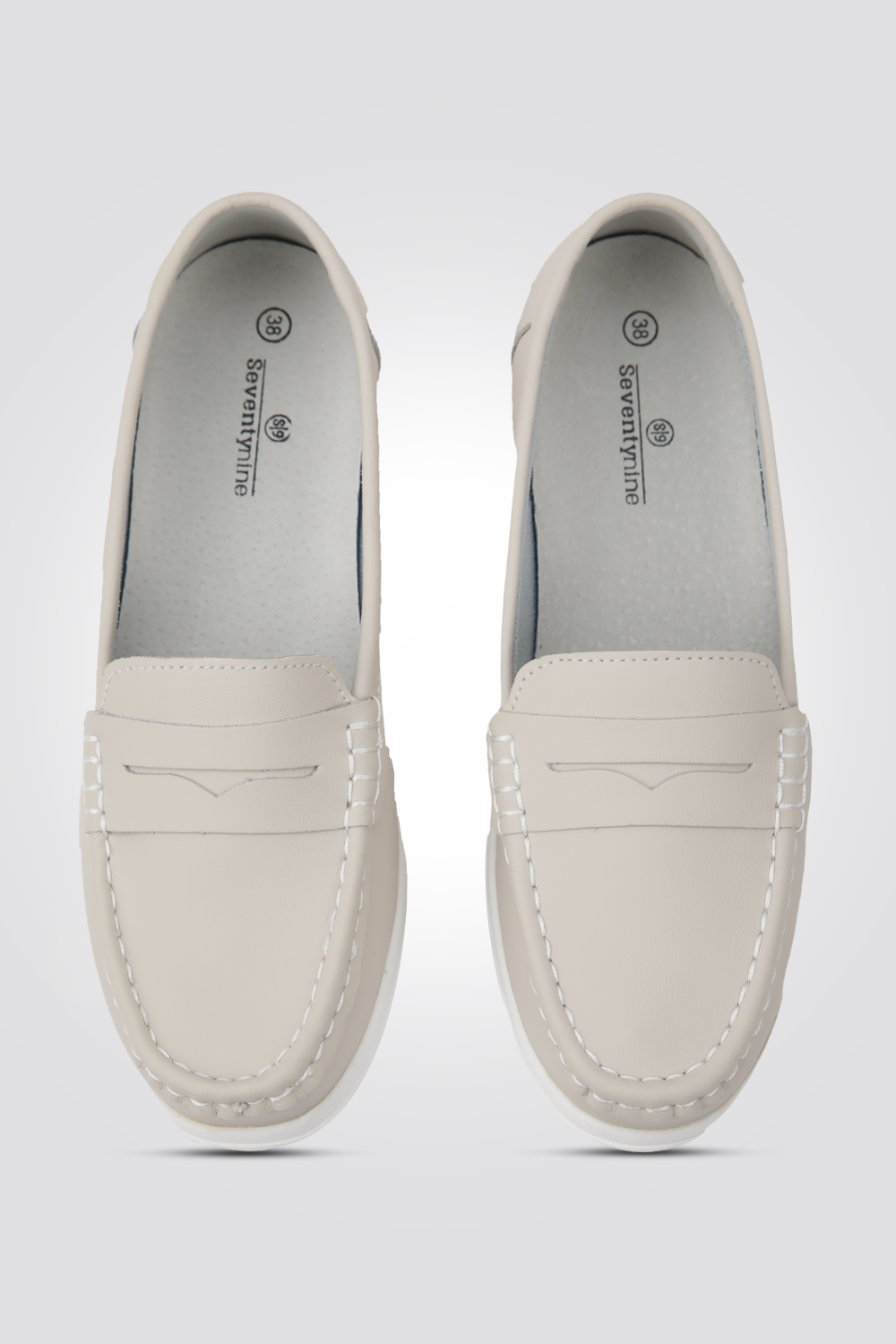 מוקסין מבית המותג Seventy Nine עשויות מעור במראה מינימליסטי עם רצועה דקורטיבית על הלשונית. חרטום עגול, מדרך רך ונוח וסוליית גומי דקה.
