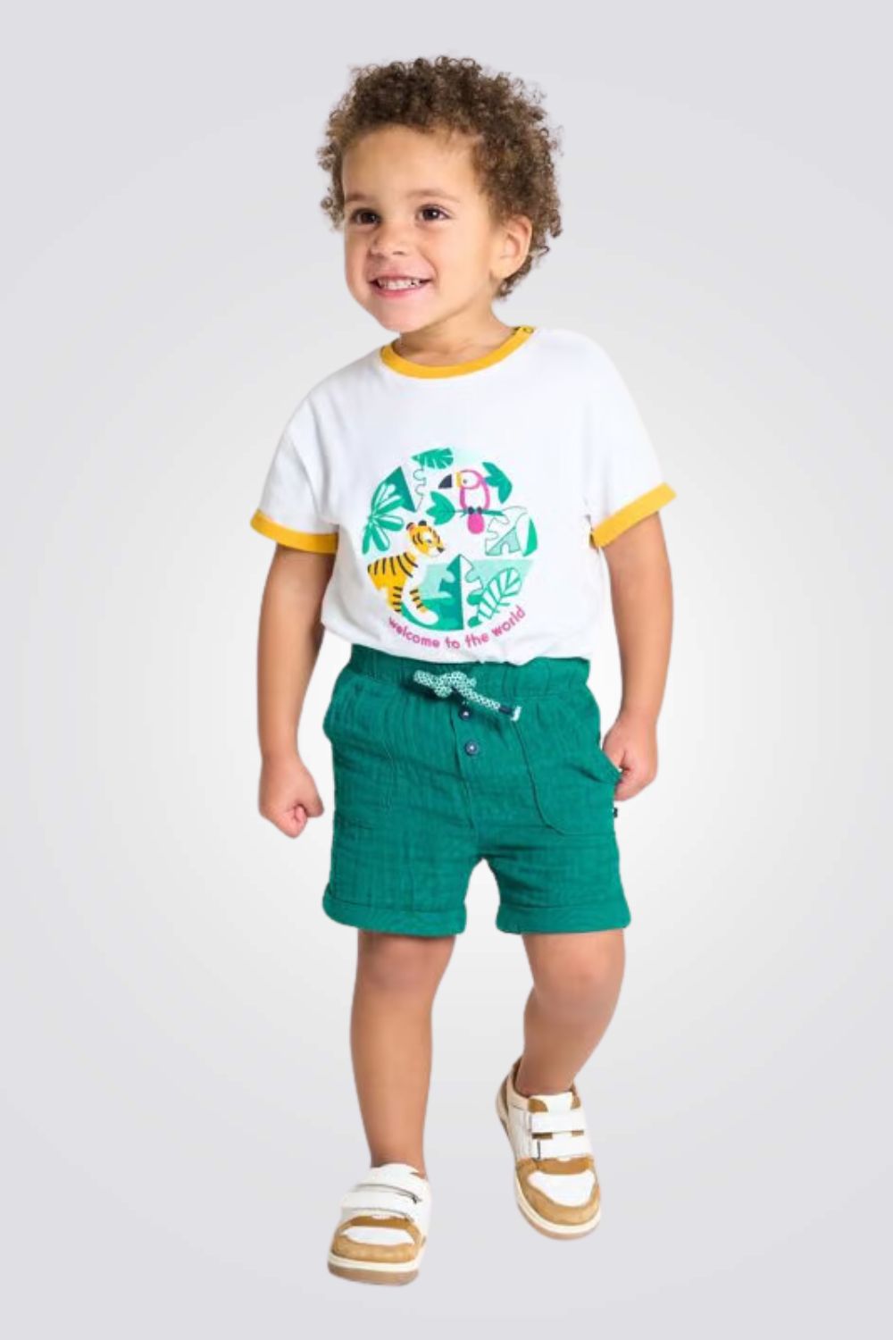 מכנסיים קצרים לתינוקות מבית המותג OBAIBI, בצבע ירוק, מותן אלסטית ושני כיסים צדדיים.