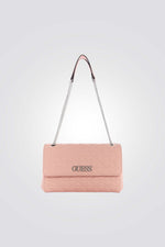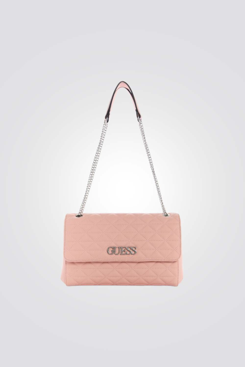 תיק קרוס תיפורים מעוינים בצבע ורוד עם תא מרכזי, אחיזה מתכתית ולוגו מלפנים מבית המותג GUESS.