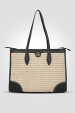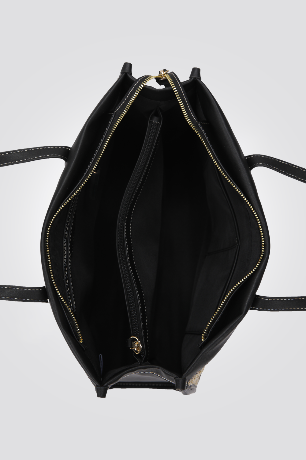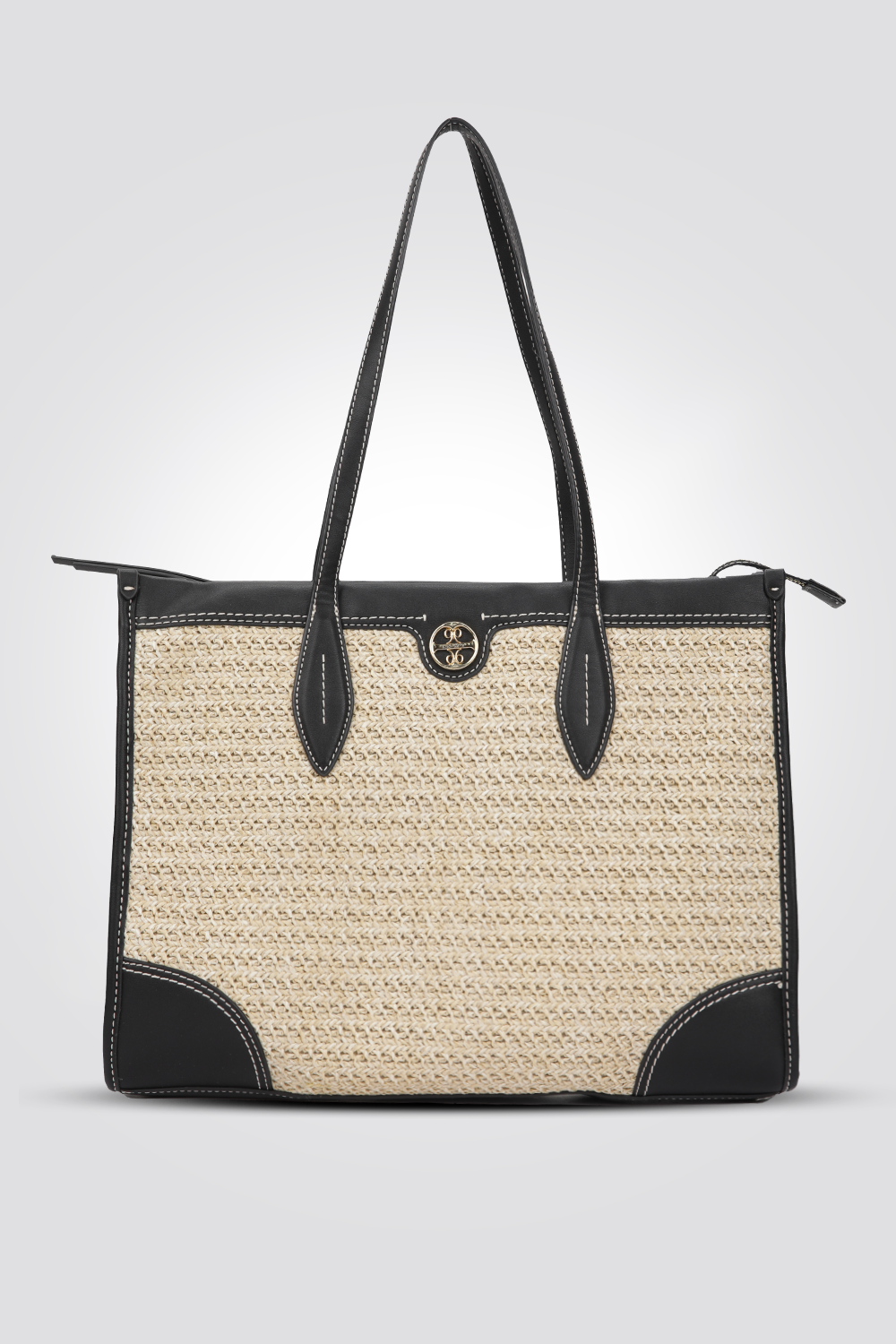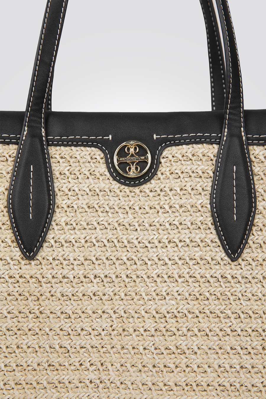 תיק צד המותג NINE WEST דמוי קש בעל תאים פנימיים לסדר וארגון ובעל רצועות וריצ'רץ' שחורים.