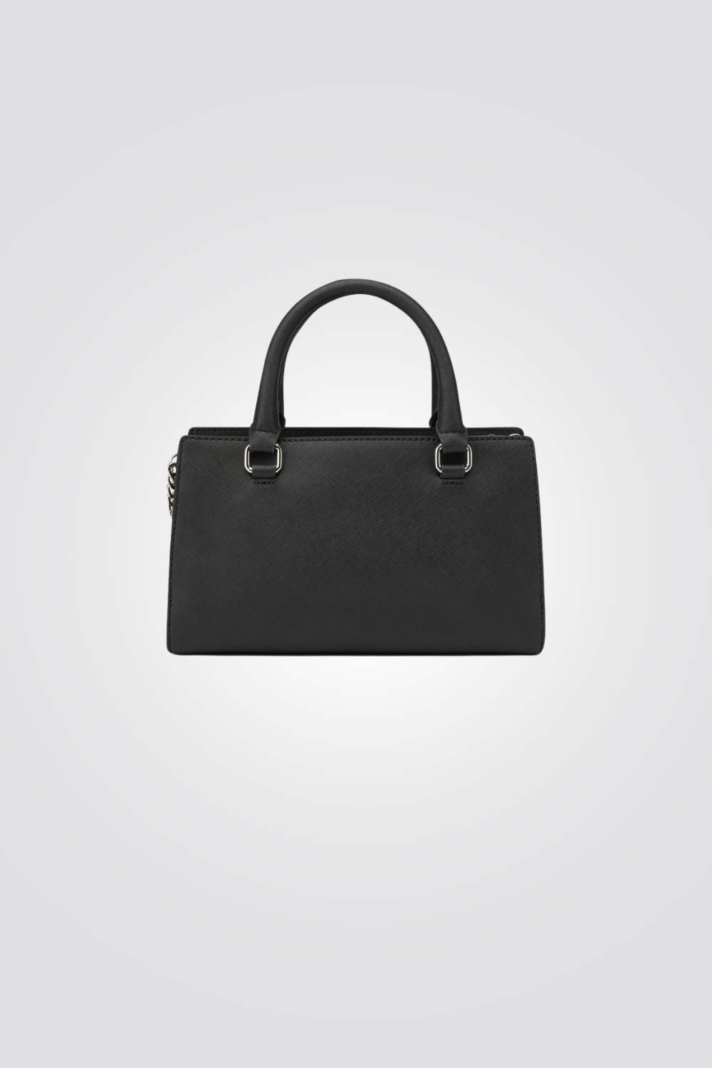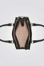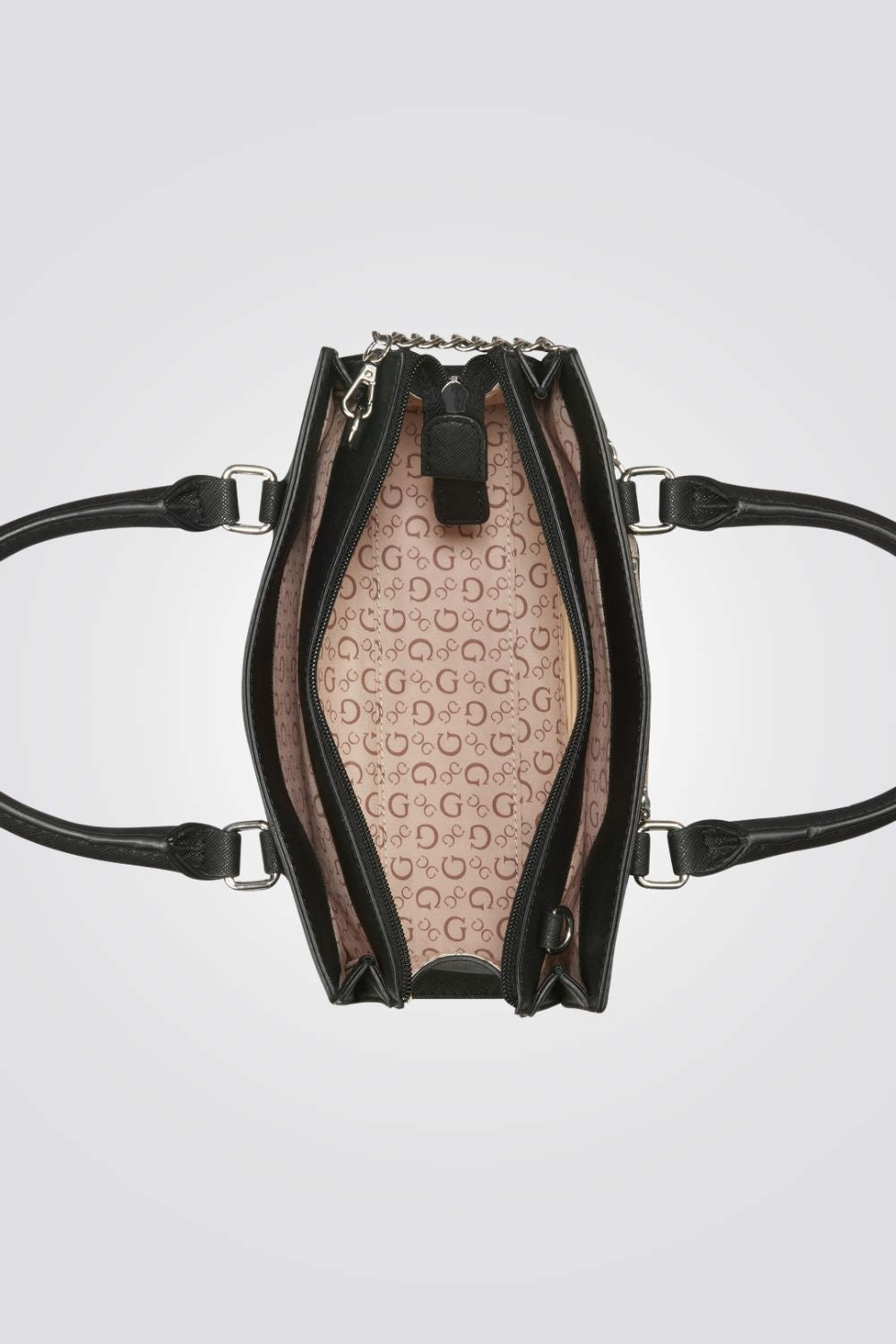 תיק יד לנשים מבית המותג GUESS, בצבע שחור , בעיצוב שמשלב סטייל וקלאסיות , תא עם סגירת רוכסן , 2 תאים חיצוניים נוספים, ארנק קטן מחובר עם שרשרת כסף, שתי רצועות יד קצרות, ועוד רצועת צד ארוכה .