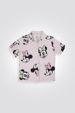 פיג'מה העשוי מבד סינגל ג’רסי קליל בהדפס של מיני מאוס, חולצה מכופתרת עם צווארון משולשים ושרוולים קצרים, ומכנסיים קצרים תואמים.