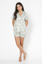 חולצה מכופתרת עם צווארון משולשים ושרוולים קצרים ומכנסיים קצרים תואמים עם כיסים.